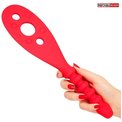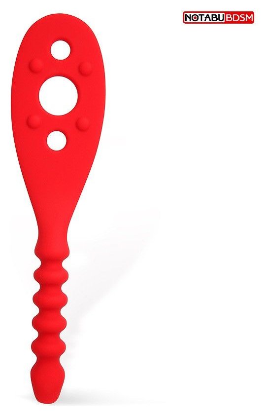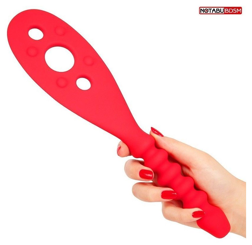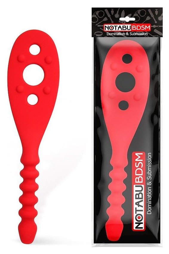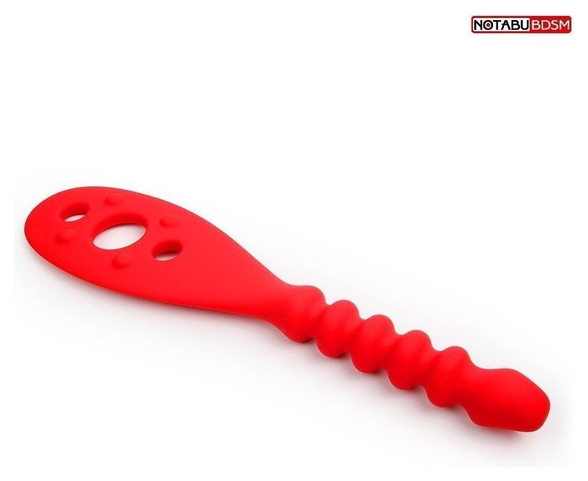 Двойной БДСМ аксессуар для любителей нестандартных эротических развлечений. Совмещает в себе шлёпалку и анальную втулку. Шлёпалка имеет широкую рабочую поверхность с жёсткими шипиками, усиливающими эффект от спанкинга. На шлёпалке имеются отверстия разного диаметра, которые могут отпечатываться на коже. Втулка имеет эргономичную форму ёлочки, способствующую более комфортному введению. Секс-игрушка изготовлена из приятного на ощупь материала, гнётся в разные стороны. Идеально подходит для «разогрева» перед интимной близостью, а также в качестве элемента в ролевой игре. Длина ручки - 11,5 см, диаметр - 2,5 см.