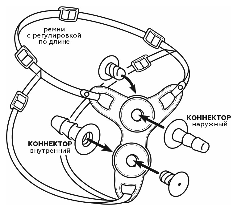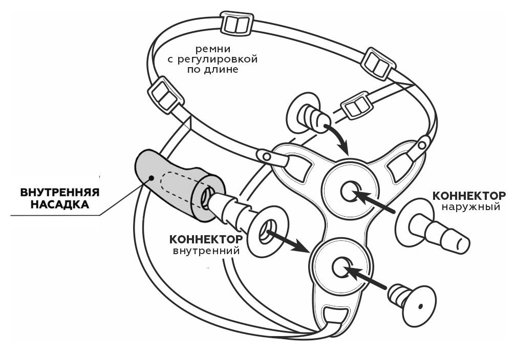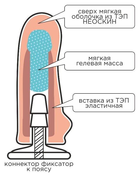 Изготовленный из полимера, пояс с отверстиями под два коннектора обладает возможностью плотного охвата тела, легкой регулировкой. Ремни из стропы средней жесткости тоже имеют умеренную эластичность, снабжены регуляторами и фастексами. Замысел конструкции в создании аналога эластичного белья, удобстве, отсутствии острых краев. Верхний коннектор (бобышка) направлен наружу для соединения с внешней насадкой. Нижний направлен внутрь и предназначен для внутренней насадки. Коннекторы состоят из двух частей, соединяемых между собой с помощью резьбы. Внутренняя насадка входит в комплект. Сделана из материала неоскин с каркасом.