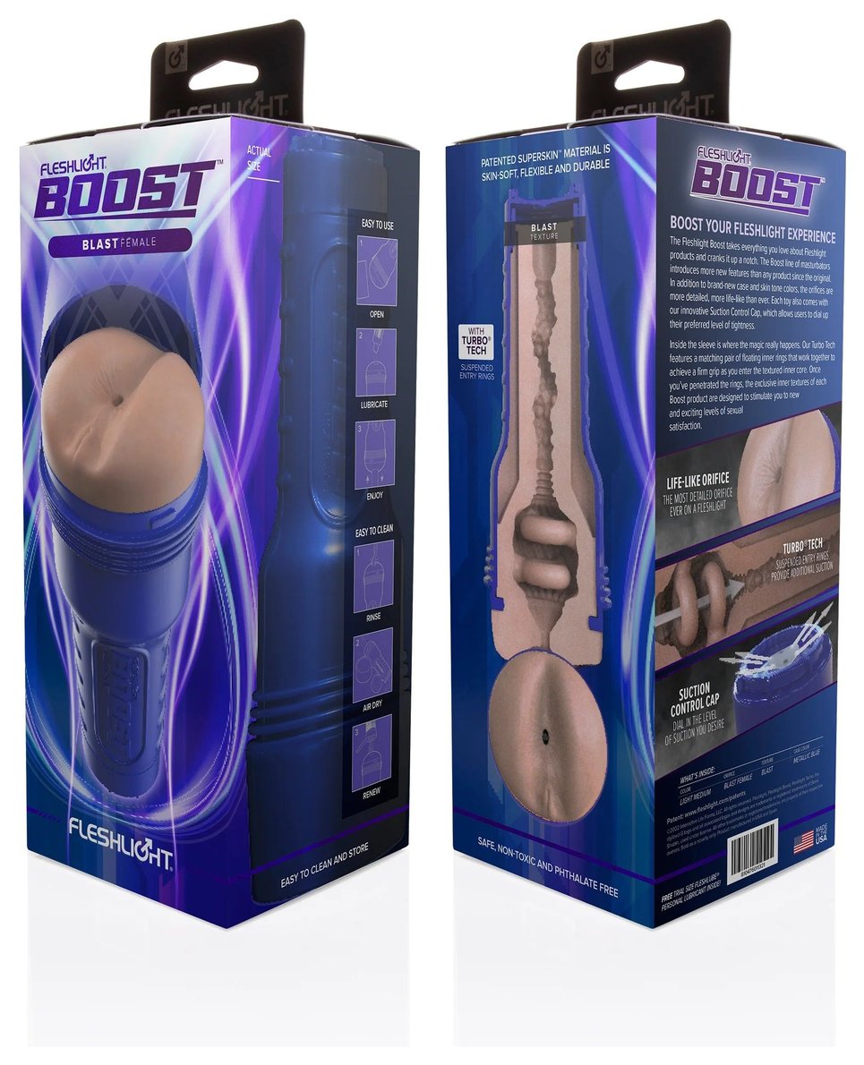 Boost Blast от Fleshlight – это инновационный продукт для соло-игр. Реалистичный внешний вид и уникальный внутренний рельеф обеспечат невероятные ощущения от мастурбации. Рукав оснащен двумя плавающими кольцами «Turbo Tech», которые надежно удерживают половой орган внутри и обеспечивают плотный захват по всей длине. После преодоления колец, вас ждет текстурный узкий коридор, который состоит из выпуклостей и ребер. Корпус мастурбатора Fleshlight имеет отверстие для выхода воздуха, благодаря которому вы сможете настроить желаемую герметичность и насладится эффектом вакуума.