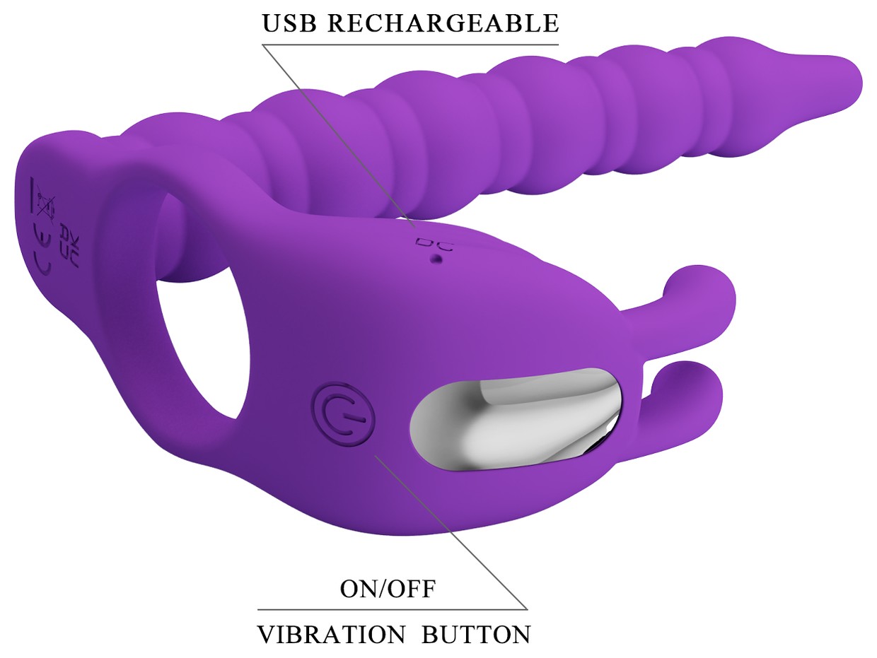 Оригинальная секс-игрушка с разнообразными режимами вибрации. Состоит из эрекционного кольца для пениса, стимулятора и вибрирующего элемента с небольшими усиками. Эрекционное кольцо повышает уровень эрекции мужчины и продлевает половой акт. Стимулятор в форме ёлочки легко входит и дарит незабываемые ощущения партнёрше. Виброэлемент с мощной вибрацией усиливает возбуждение. 7 режимов вибрации. Усики воздействуют на клитор. Интимный аксессуар изготовлен из приятного на ощупь бархатистого материала, прост в применении и уходе.