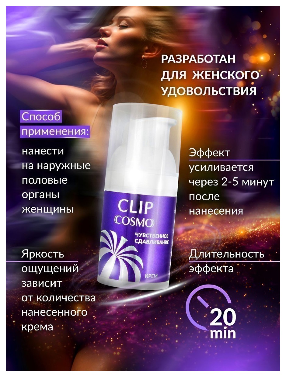 Возбуждающий крем быстрого действия Clip разработан специально для женского удовольствия. Во время использования приятно разогревает и дарит ощущение сдавливания в месте нанесения. Эффект усиливается через 2-5 мин. и длится 15-20 мин. Яркость ощущений зависит от количества крема. Чем больше его наносится, тем сильнее эффект. Крем Clip имеет нежную приятную консистенцию, увлажняет и тонизирует.