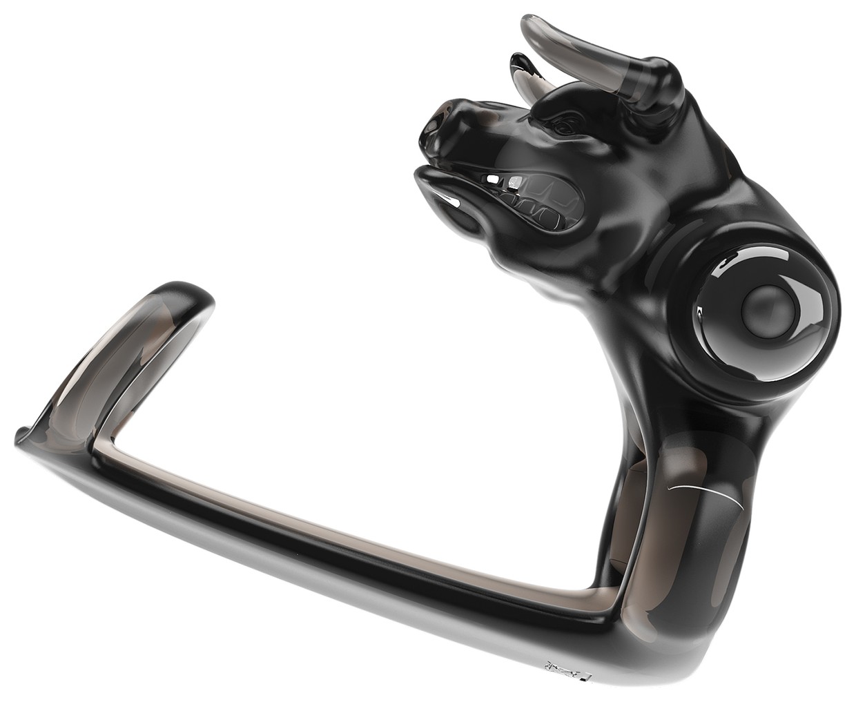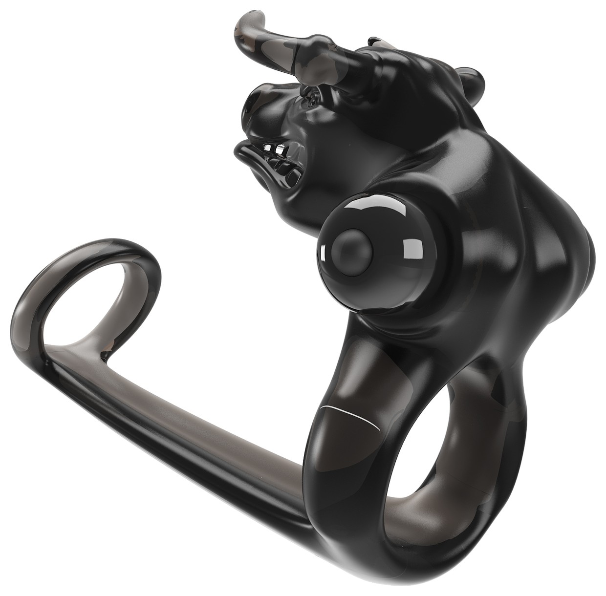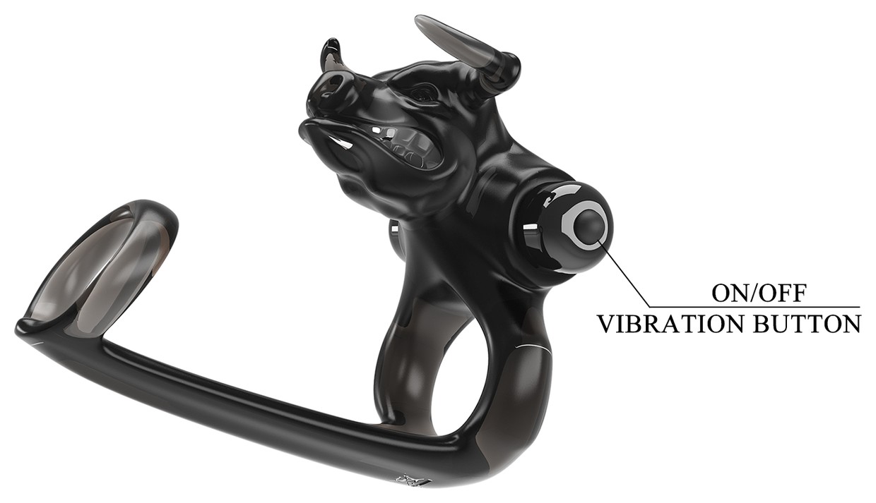 Насадка на пенис с вибратором для клитора в виде головы быка и дополнительным кольцом под головку. Имеет 10 режимов вибрации. Диаметр колец - 2,8 и 3,5 см.