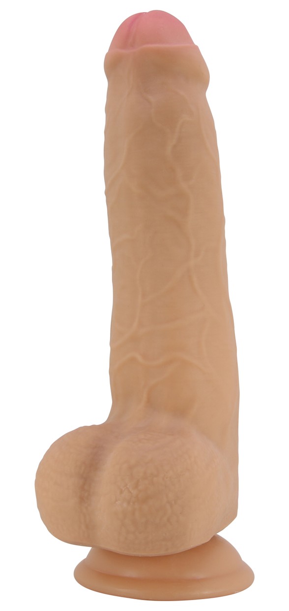 Фаллоимитатор с мошонкой на присоске из двухслойного материала. Двойной слой кожи позволяет имитировать скольжение кожи на фаллоимитаторе. Рабочая длина - 15,5 см.