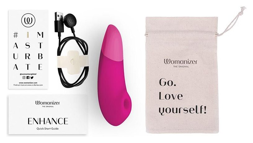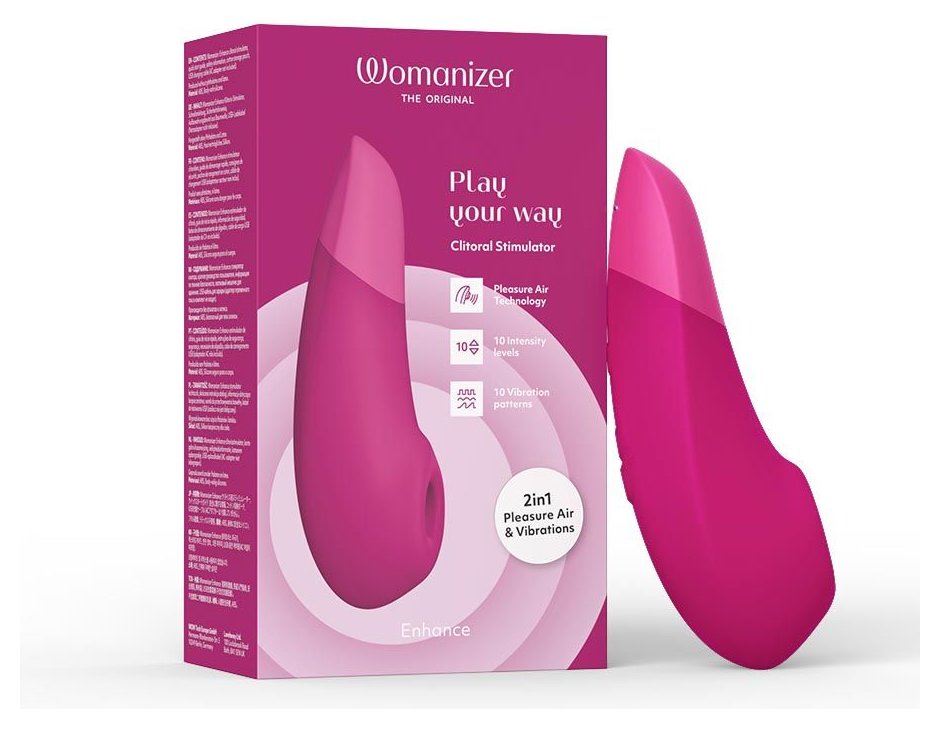 Первый клиторальный стимулятор Womanizer, сочетающий вибрацию We-Vibe и технологию Pleasure Air для усиления ощущений. Раздельные моторчики позволяют использовать эти виды стимуляции вместе или по отдельности, чтобы разнообразить ваше путешествие. В вашем распоряжении 10 уровней интенсивности Pleasure Air, 10 уровней мощности вибрации и 10 режимов вибрации, которые регулируются индивидуально, - более 1000 способов получить удовольствие с Womanizer Enhance. Переключать режимы для обоих видов стимуляции возможно вместе и или по отдельности, благодаря кнопкам на корпусе. Полный заряд достигается за 2 часа и обеспечивает до 120 минут работы моторчиков. Этот вибратор имеет более широкую интегрированную головку, которая стимулирует большую площадь поверхности, усиливая ощущения. Корпус покрыт мягким шелковистым силиконом, не содержит токсичных веществ и безопасен для кожи человека. Womanizer Enhance полностью водонепроницаем, поэтому подходит для игр в ванной или душе.