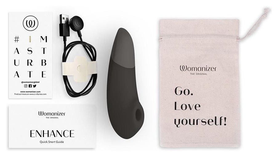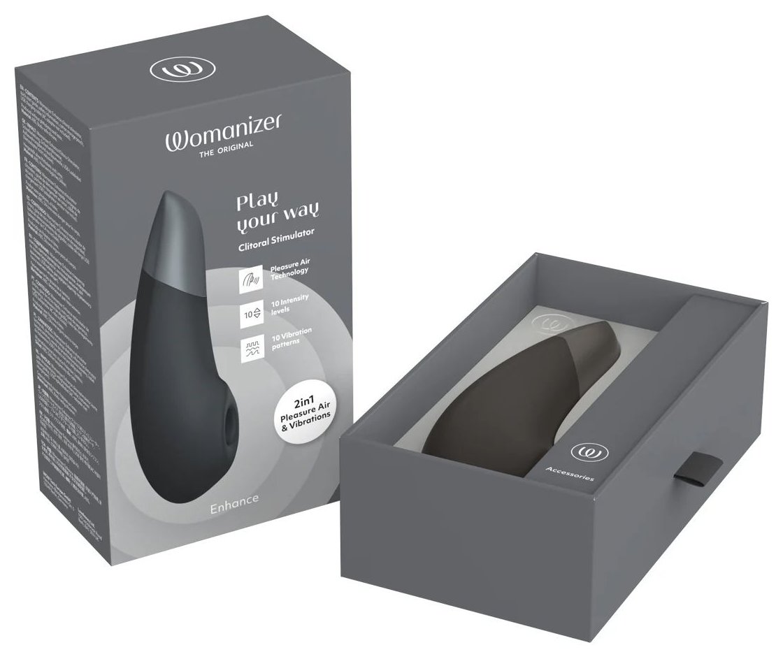 Первый клиторальный стимулятор Womanizer, сочетающий вибрацию We-Vibe и технологию Pleasure Air для усиления ощущений. Раздельные моторчики позволяют использовать эти виды стимуляции вместе или по отдельности, чтобы разнообразить ваше путешествие. В вашем распоряжении 10 уровней интенсивности Pleasure Air, 10 уровней мощности вибрации и 10 режимов вибрации, которые регулируются индивидуально, - более 1000 способов получить удовольствие с Womanizer Enhance. Переключать режимы для обоих видов стимуляции возможно вместе и или по отдельности, благодаря кнопкам на корпусе. Полный заряд достигается за 2 часа и обеспечивает до 120 минут работы моторчиков. Этот вибратор имеет более широкую интегрированную головку, которая стимулирует большую площадь поверхности, усиливая ощущения. Корпус покрыт мягким шелковистым силиконом, не содержит токсичных веществ и безопасен для кожи человека. Womanizer Enhance полностью водонепроницаем, поэтому подходит для игр в ванной или душе.