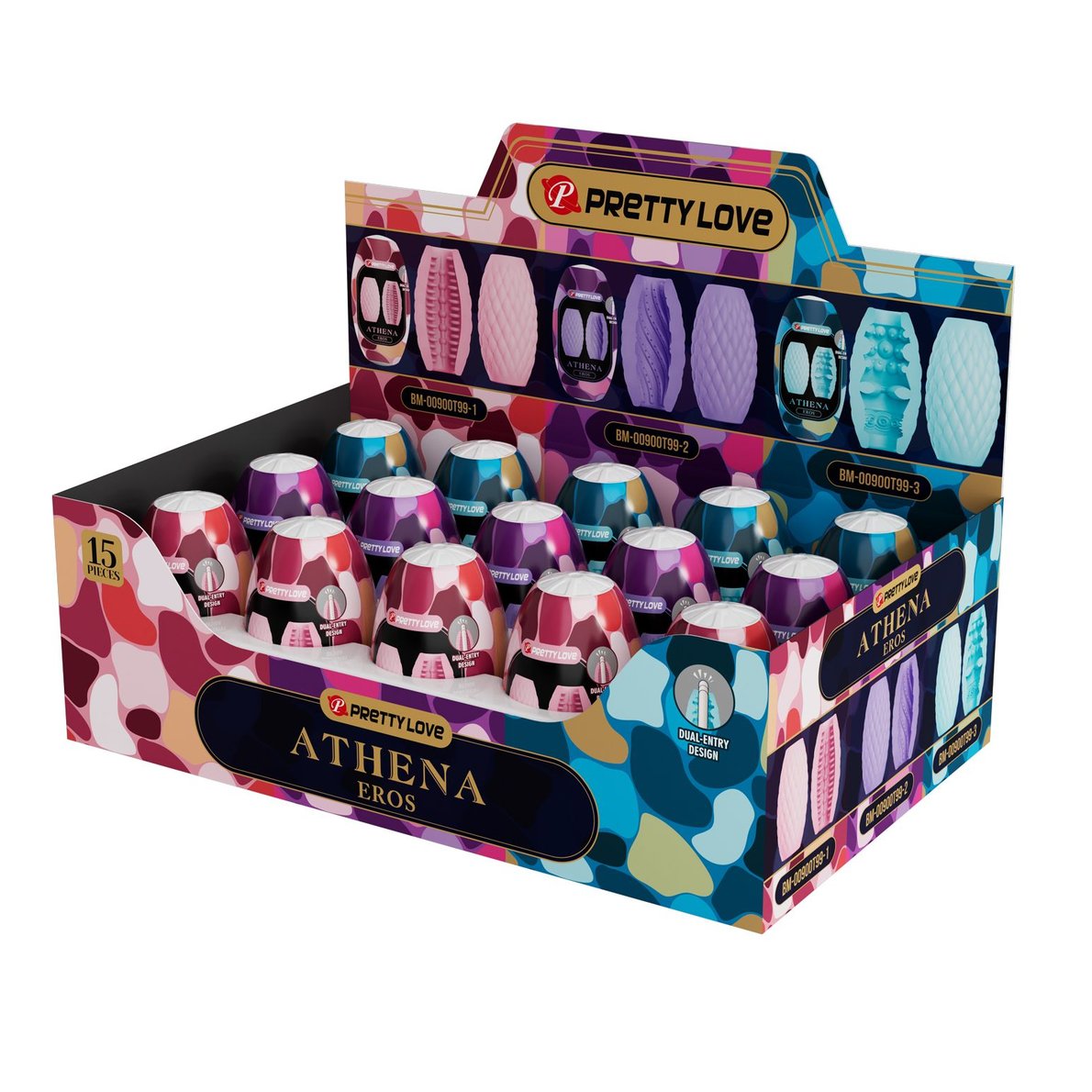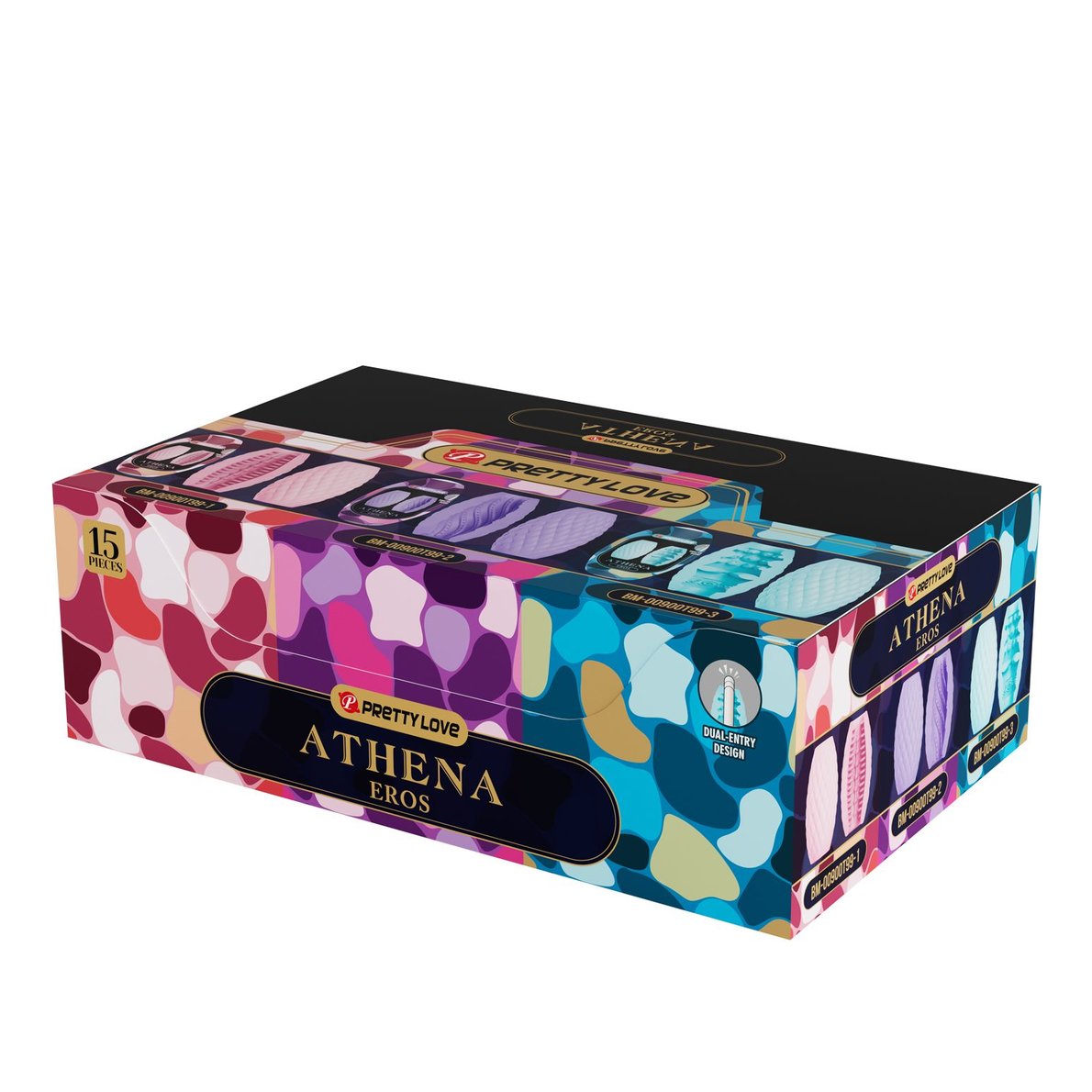 Набор из 15 мастурбаторов Athena в коробке. В наборе 3 вида мастурбаторов, по 5 штук каждого вида. Мастурбатор Athena - нежный и эластичный. Приятный рельеф внутри и снаружи.