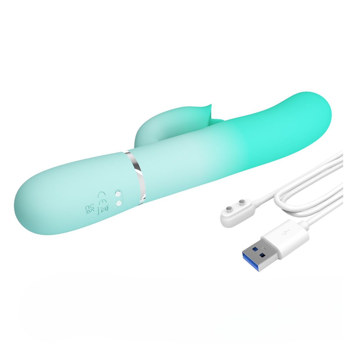 Силиконовый вибратор с 7 режимами поступательных движений и лизания. Стимулирует две зоны сразу. Кнопка для взрывного оргазма. Заряжается через магнитный USB. Рабочая длина - 12,5 см.