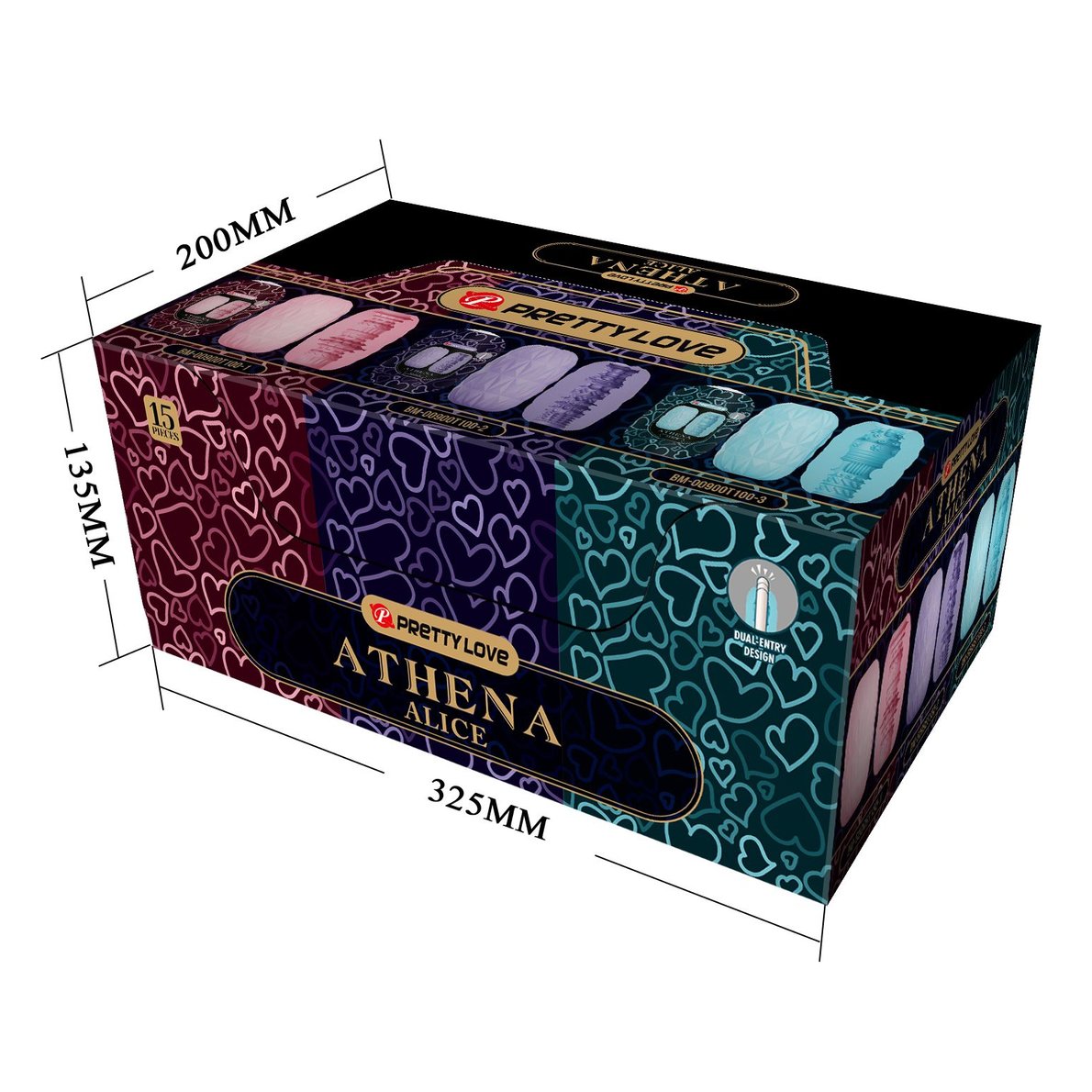 Набор из 15 мастурбаторов Athena Alice в коробке. В наборе 3 вида мастурбаторов, по 5 штук каждого вида. Мастурбатор Athena Alice - нежный и эластичный. Приятный рельеф внутри и снаружи.