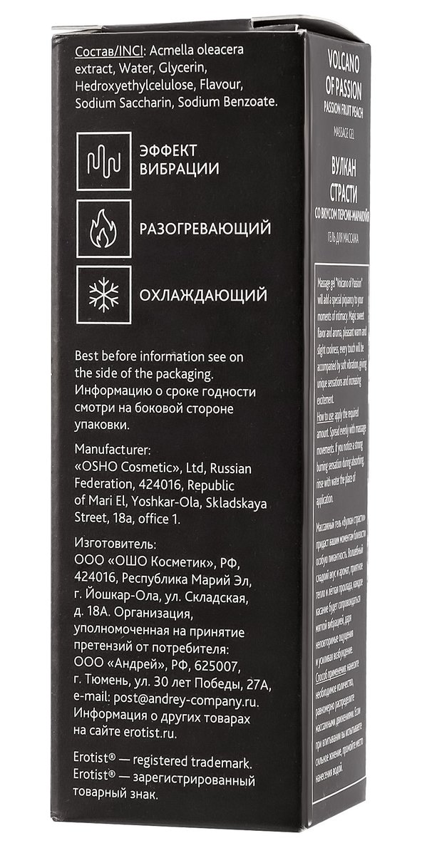 Массажный гель «Вулкан страсти» придаст вашим моментам близости особую пикантность. Волшебный сладкий вкус и аромат, приятное тепло и лёгкая прохлада, каждое касание будет сопровождаться мягкой вибрацией, даря неповторимые ощущения и усиливая возбуждение. Нанесите немного жидкого геля на интимные зоны, и через несколько секунд вы почувствуете тепло, затем в течение 2-3 минут легкую вибрацию и легкий холодок. Длительность эффекта зависит от особенностей вашего организма. Гель с вибрирующим эффектом для интимных зон на основе натуральных ингредиентов, без парабенов. Вкус и аромат персик-маракуйя. Подходит для поцелуев и орального секса.