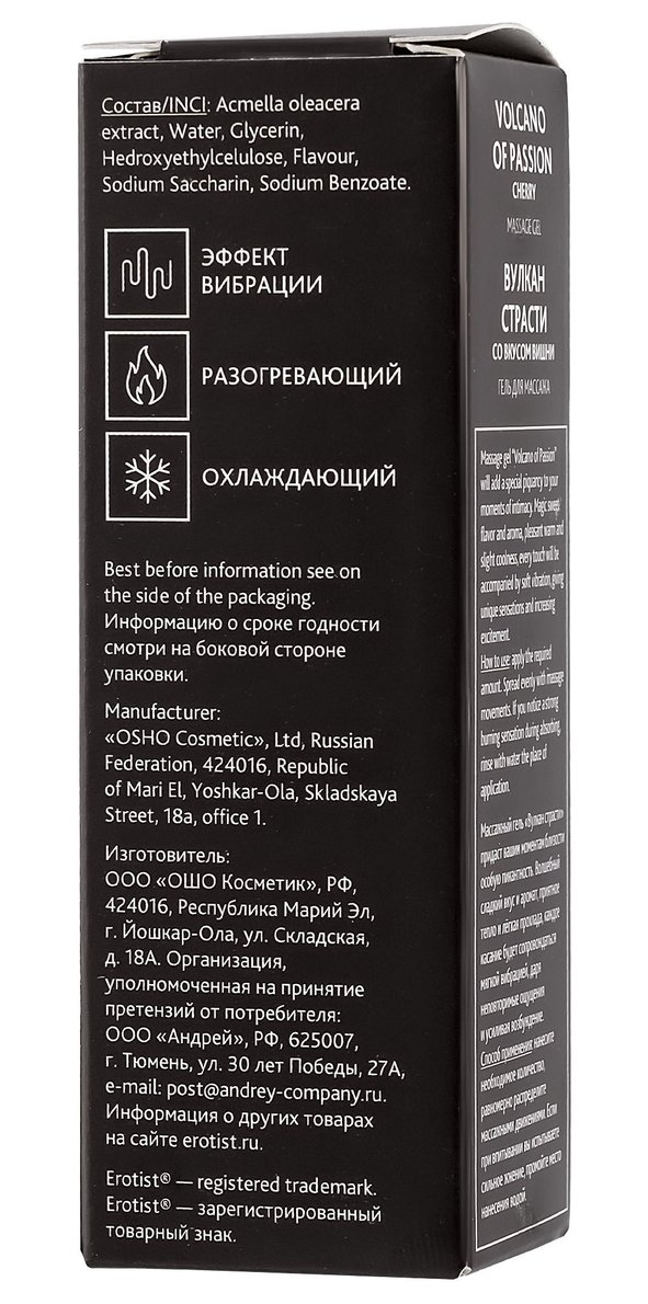 Массажный гель «Вулкан страсти» придаст вашим моментам близости особую пикантность. Волшебный сладкий вкус и аромат, приятное тепло и лёгкая прохлада, каждое касание будет сопровождаться мягкой вибрацией, даря неповторимые ощущения и усиливая возбуждение. Нанесите немного жидкого геля на интимные зоны, и через несколько секунд вы почувствуете тепло, затем в течение 2-3 минут легкую вибрацию и легкий холодок. Длительность эффекта зависит от особенностей вашего организма. Гель с вибрирующим эффектом для интимных зон на основе натуральных ингредиентов, без парабенов. Вкус и аромат вишни. Подходит для поцелуев и орального секса.