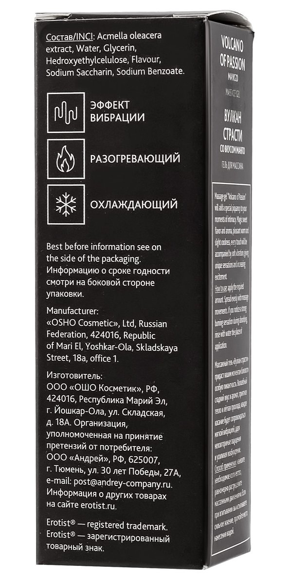 Массажный гель «Вулкан страсти» придаст вашим моментам близости особую пикантность. Волшебный сладкий вкус и аромат, приятное тепло и лёгкая прохлада, каждое касание будет сопровождаться мягкой вибрацией, даря неповторимые ощущения и усиливая возбуждение. Нанесите немного жидкого геля на интимные зоны, и через несколько секунд вы почувствуете тепло, затем в течение 2-3 минут легкую вибрацию и легкий холодок. Длительность эффекта зависит от особенностей вашего организма. Гель с вибрирующим эффектом для интимных зон на основе натуральных ингредиентов, без парабенов. Вкус и аромат манго. Подходит для поцелуев и орального секса.