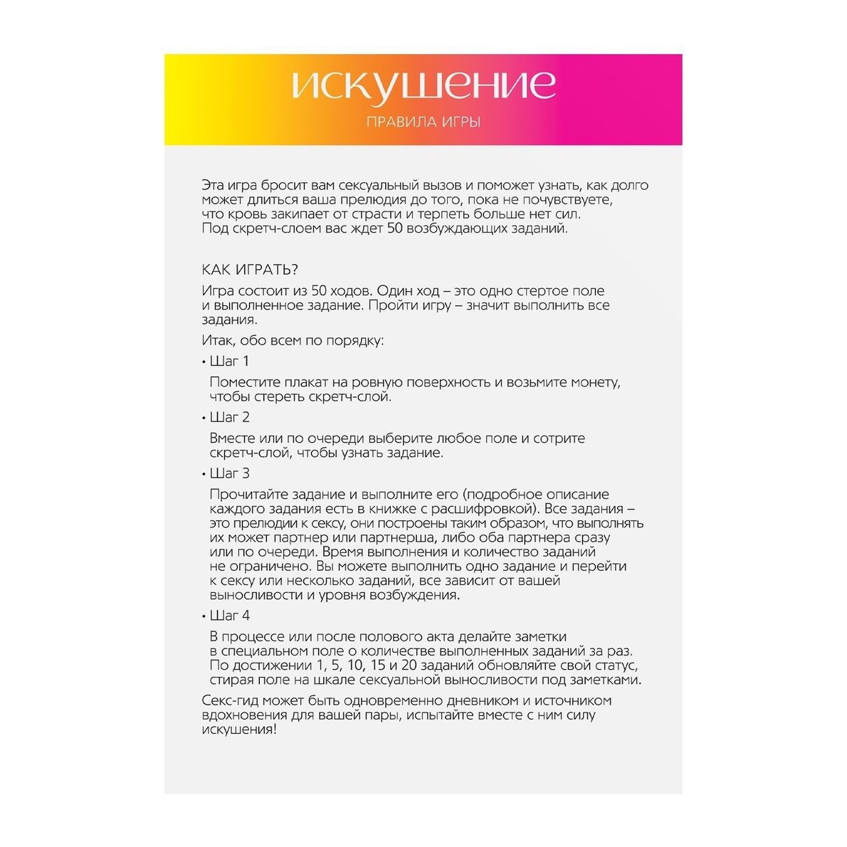 Эта игра бросит вам сексуальный вызов и поможет узнать, как долго может длиться ваша прелюдия до того, пока вы не почувствуете, что кровь закипает от страсти и терпеть больше нет сил. Под скретч-слоем вас ждут 50 возбуждающих заданий для двоих. Все задания — это прелюдия к сексу. Они построены таким образом, что выполнять их может партнёр, партнёрша, оба партнёра сразу или же по очереди. Время выполнения и количество заданий не ограничено. Игра состоит из 50 горячих ходов. Один ход — это одна стёртая клетка и одно выполненное задание. Вместе или по очереди выберите любую клетку и сотрите скретч-слой, чтобы узнать задание. Пройти игру — значит выполнить все задания. Не забывайте делать заметки о количестве выполненных заданий за раз в специальном поле. По достижении 1, 5, 10, 15 и 20 заданий обновляйте свой статус, стирая клетки на шкале сексуальной выносливости под заметками. Секс-гид может быть одновременно дневником и источником вдохновения для вашей пары. Испытайте силу искушения! Внутри вы найдёте: скретч-плакат, 29,7 × 42 см, книжки с расшифровкой заданий, правила игры.