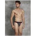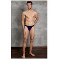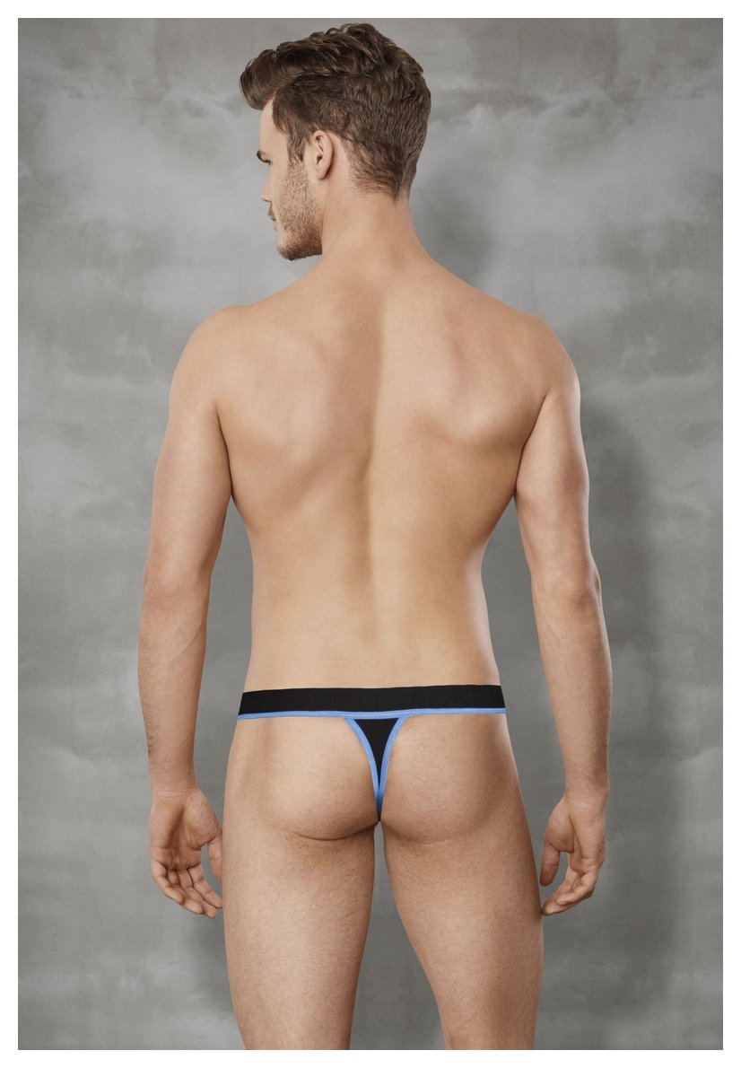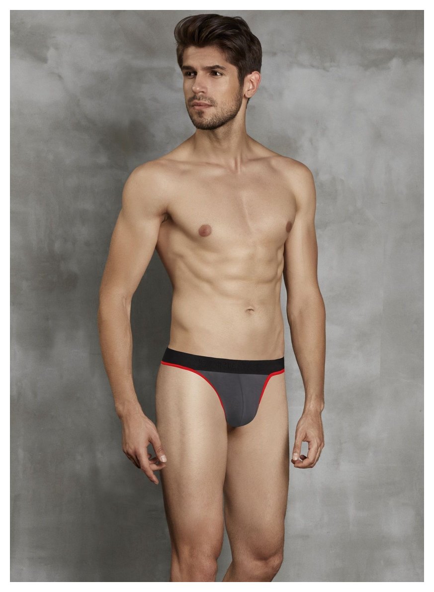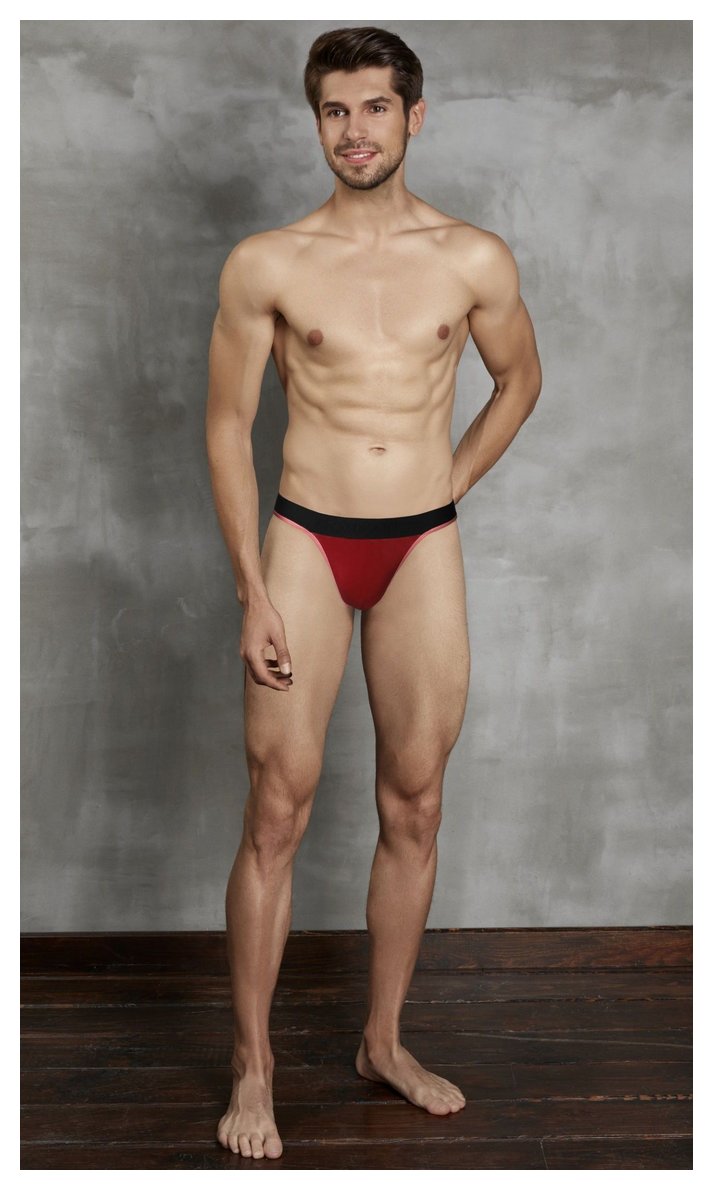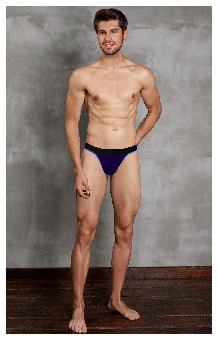 Мужские стринги на пришивной резинке от «Doreanse». Края передней панели, низ пришивной резинки и задняя лямочка украшены контрастным эластичным кантом. Передняя панель однослойная, без подкладки.