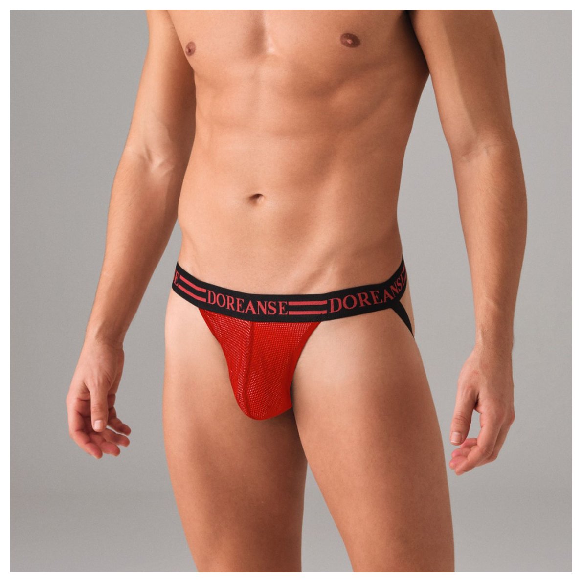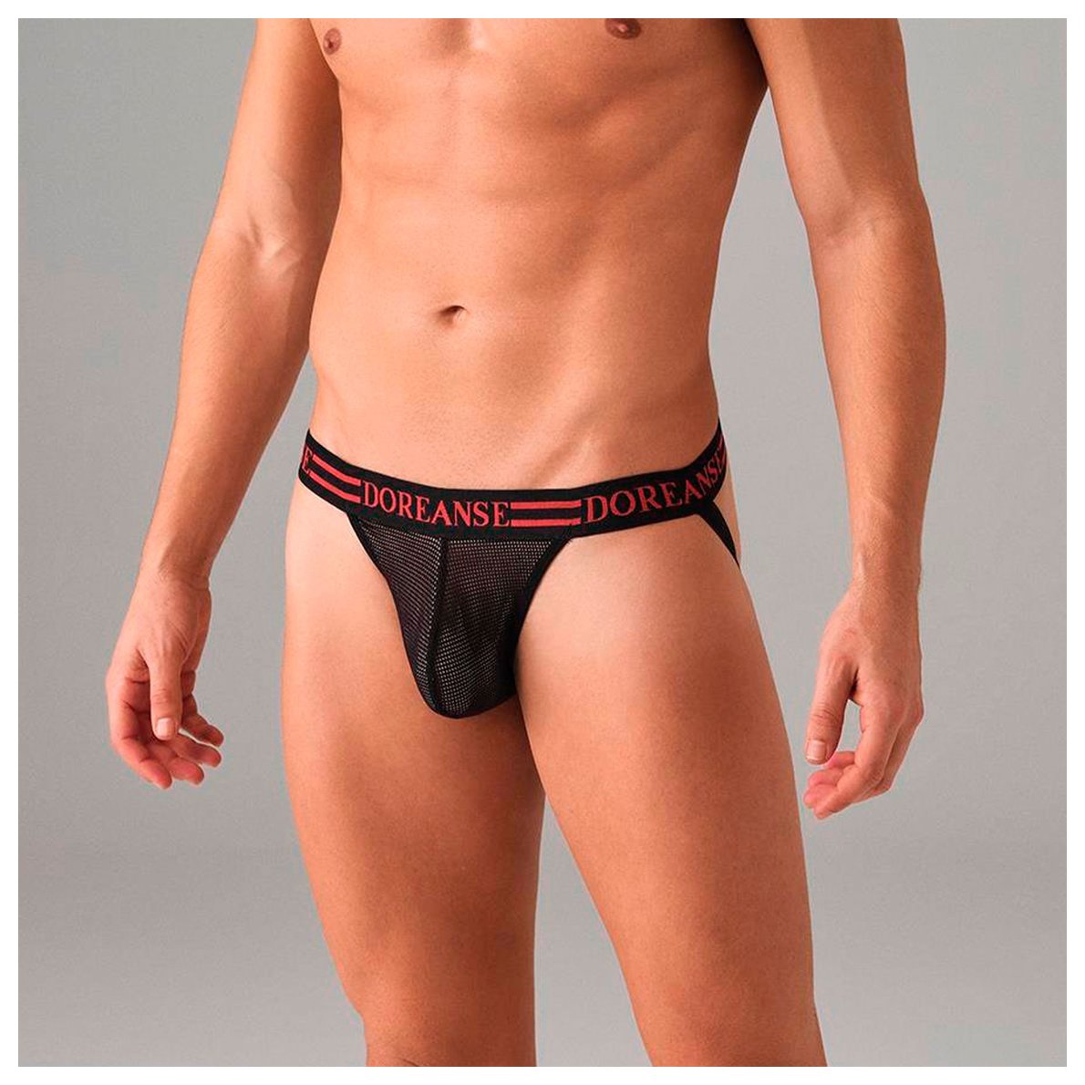 Мужские трусы-джоки из эластичной сеточки. Подкладка бежевого (телесного) цвета создаёт иллюзию полной прозрачности. Резинка на поясе украшена фирменным логотипом бренда DOREANSE. Прекрасный выбор для горячих спортивных парней!