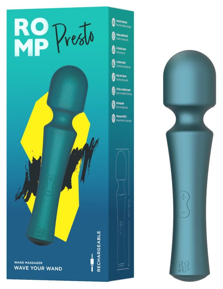 ROMP Presto — это беспроводной мини-вибратор типа Wand, который поистине творит волшебство. Благодаря 6 уровням интенсивности и 4 режимам мощных вибраций, эта игрушка вызывает самые яркие эмоции по мановению волшебной палочки. Гладкая и очень мягкая силиконовая головка обеспечивает разнообразную и интенсивную стимуляцию, идеально воздействующую как раз там, где нужно. Водонепроницаемый и перезаряжаемый ROMP Presto с функцией транспортной блокировки создан для удобства и незабываемого удовольствия в любых условиях, в том числе в воде. Для использования просто нанесите немного смазки на водной основе на головку вибратора и на кожу для максимального комфорта. Нажмите и удерживайте кнопку в течение 3 секунд, чтобы активировать вибрацию. Мощный моторчик подарит до 70 минут удовольствия при полной зарядке до 130 минут.