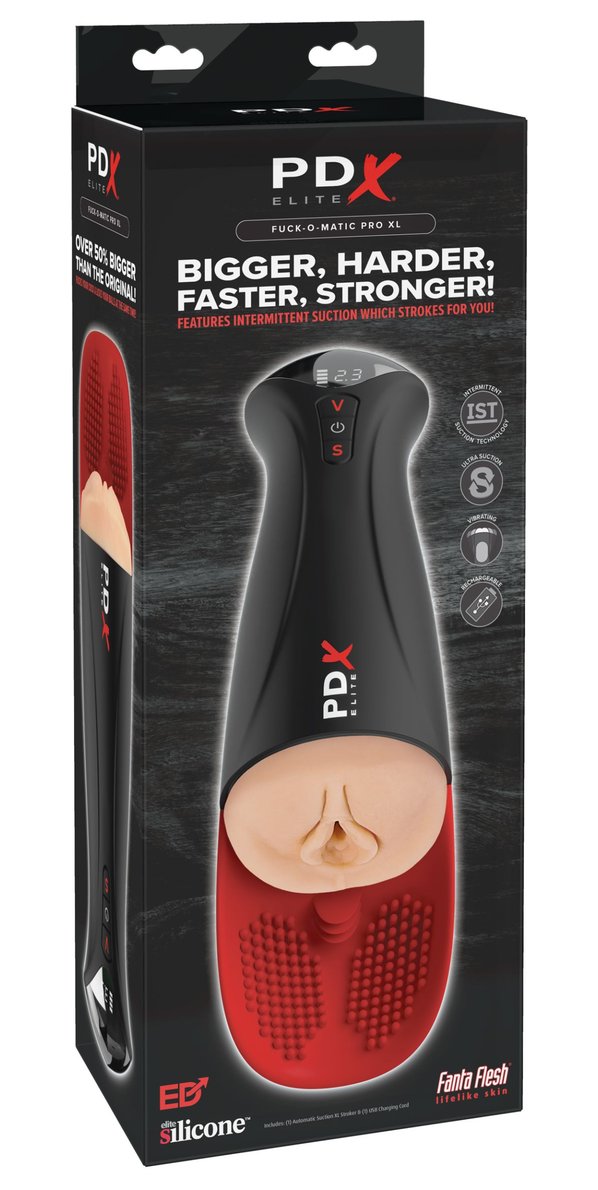 PDX Elite Fuck-O-Matic Pro XL – увеличенный мастурбатор с технологией прерывистого всасывания и вибрацией для персонализированных сольных сессий. Мягкие стимуляторы обеспечивают дополнительную стимуляцию, а съемная вставка из ультрамягкого материала создает реалистичные ощущения. Корпус в телесном, черном и красном цветах оснащен LED-дисплеем для удобного выбора режимов. Прерывистое всасывание: 5 режимов для автоматического движения. Вибрация: 5 режимов для индивидуальной настройки. LED-дисплей отображает режимы всасывания (1-5) и вибрации (1-5). Рабочая длина - 16,5 см.