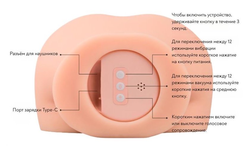 Ультрареалистичный мастурбатор, созданный в форме округлых ягодиц, сочетает в себе 12 режимов вибрации, 12 уровней вакуумной стимуляции и звуковую дорожку — это усиливает восприятие и делает использование не только физически, но и эмоционально вовлекающим. Текстурированный внутренний туннель усиливает стимуляцию и обеспечивает эффект, максимально приближённый к реальному. Изделие выполнено из мягкого и приятного на ощупь TPE, не содержащего фталатов, что делает его безопасным для тела и комфортным при контакте с кожей. Мастурбатор прост в управлении: короткими нажатиями можно переключать режимы вибрации и всасывания, а отдельная кнопка активирует звуковую дорожку. Устройство заряжается через порт Type-C, поддерживает подключение наушников и защищено от брызг воды по стандарту IPX5, что упрощает очистку и продлевает срок службы.