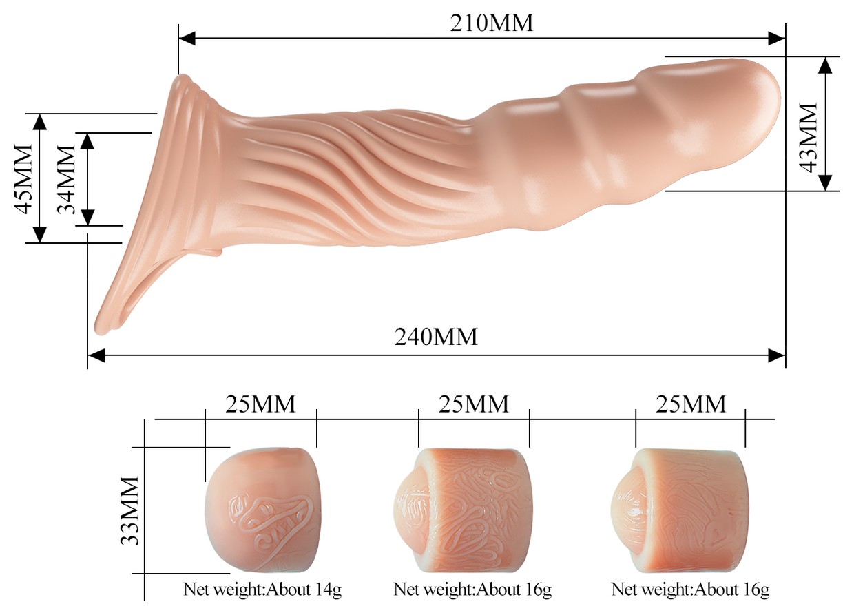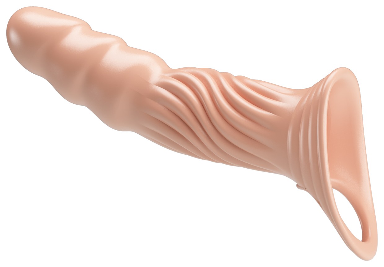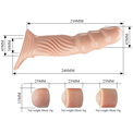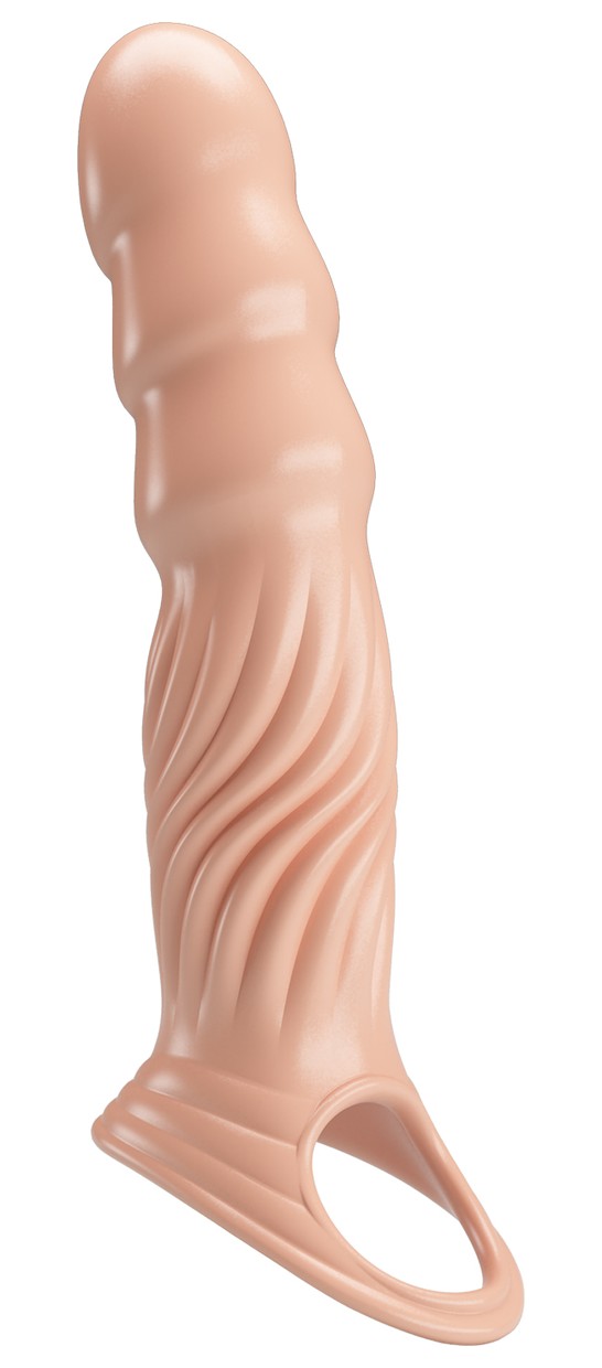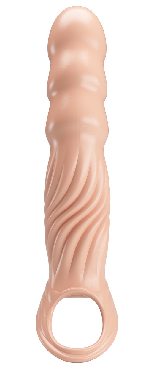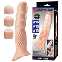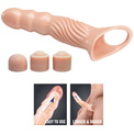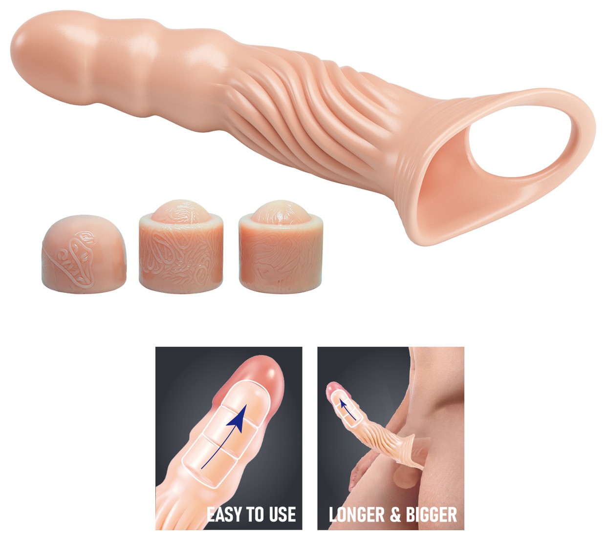 Насадка на пенис – это отличное и безопасное средство увеличить половой член, продлив при этом секс и подарив партнерше море приятных возбуждающих ощущений. Этот интим-товар выполнен из качественного эластичного материала, способного растягиваться под размер пениса, плотно прилегая к нему и не соскальзывая. Изделие имеет 3 сменных вкладыша, каждый из которых увеличивает длину пениса на 1 см. Насадка обладает дополнительным рельефом, который подарит дополнительную стимуляцию партнерше. Рабочая длина - 21 см.