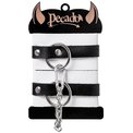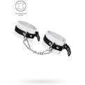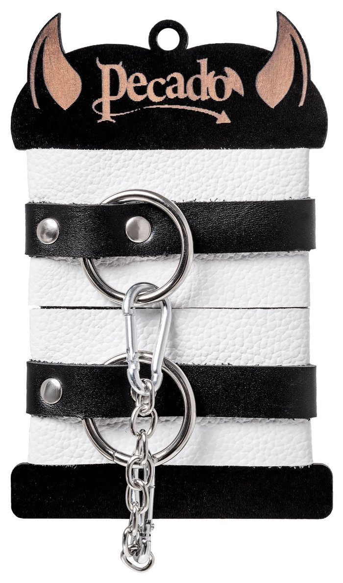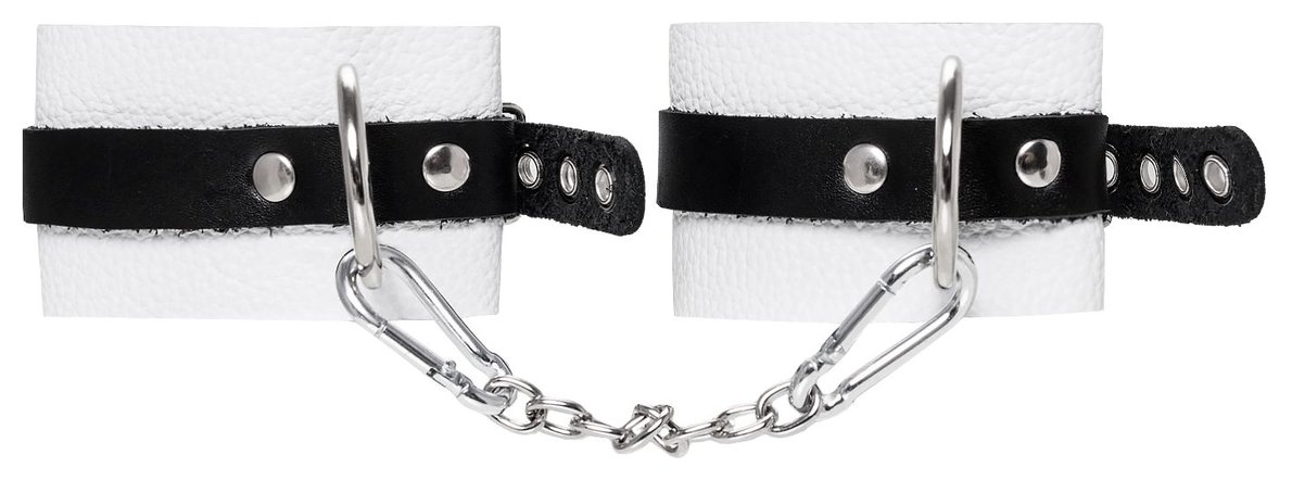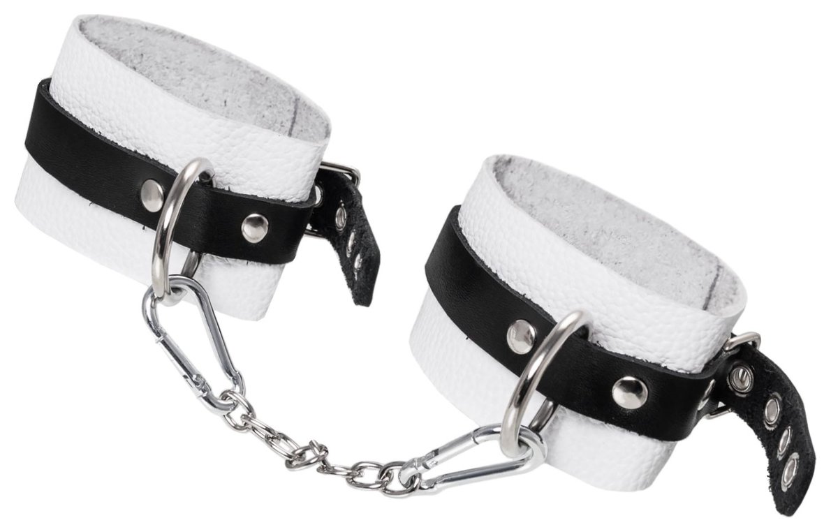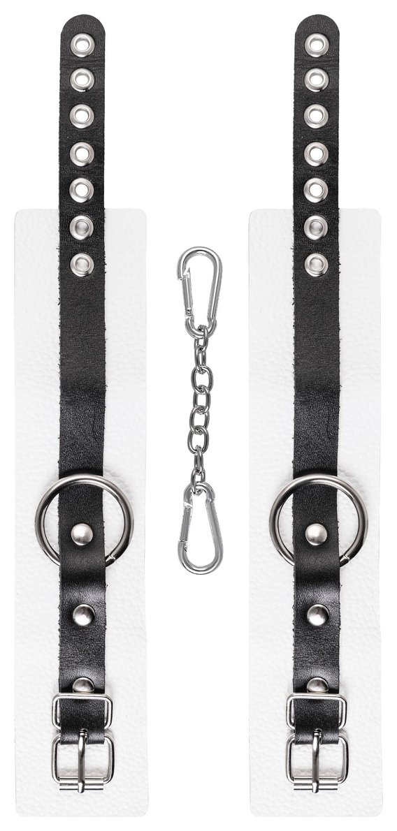 Мягкие оковы с жёсткими ремешками от Pecado помогут обездвижить партнера во время сексуальных прелюдий или жестких БДСМ-играх. Наручники изготовлены полностью из белой, натуральной кожи. Ремешки выполнены из чёрной жёсткой кожи, украшены люверсами. Выделка материала произведена вручную. Ремешки и широкая манжета хорошо держат форму: не тянутся и не мнутся. Качественная металлическая фурнитура добавляет лоска изделию, а аромат натуральной кожи повышает градус возбуждения. Благодаря широкому запасу регулировок, можно подобрать необходимый обхват. Аксессуар удобно застегивать и легко расстегивать. При правильном использовании не оставляет следов на теле и не доставляет дискомфорта. Манжеты оков соединяется между собой помощью двух карабинов и съемной стальной цепочки. Подходит и для женских, и для мужских ног. Длина манжет - 25 см, ширина - 5,5 см. Длина сцепки - 24 см/