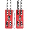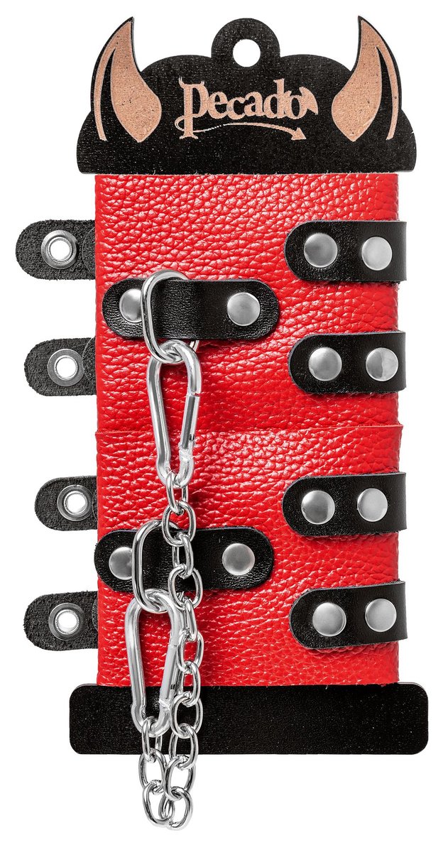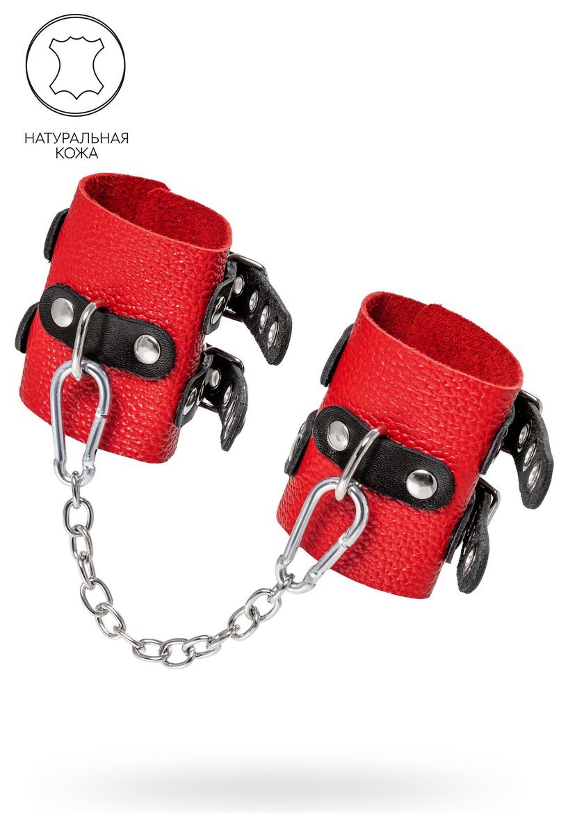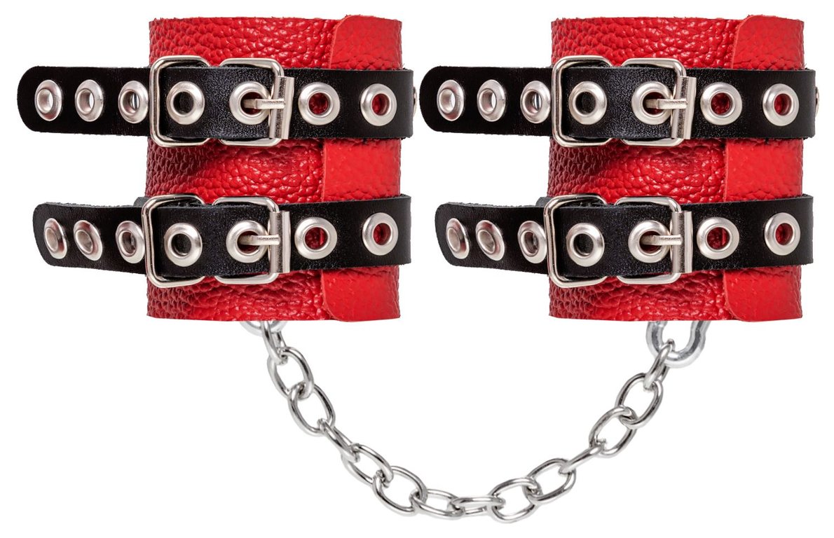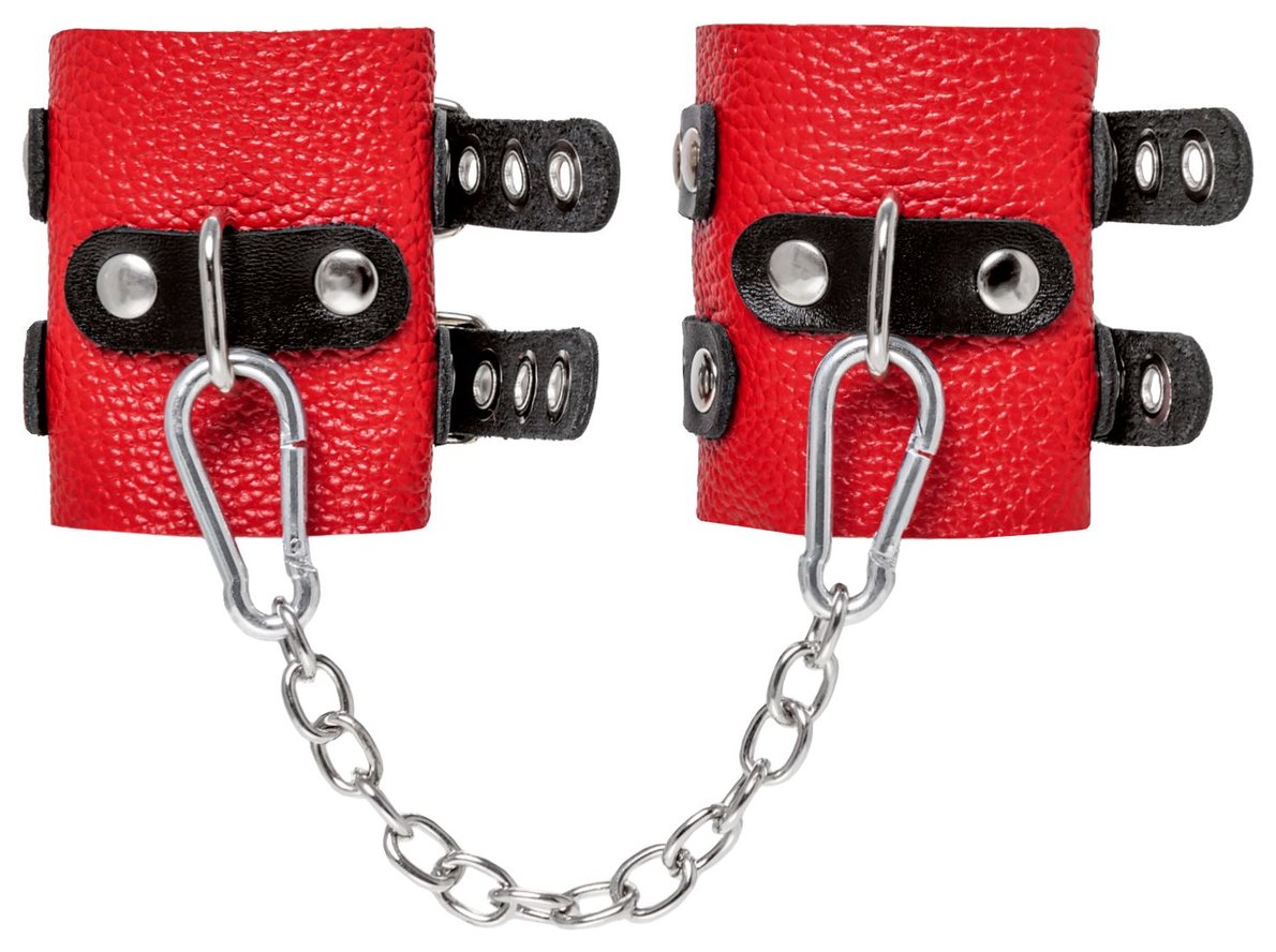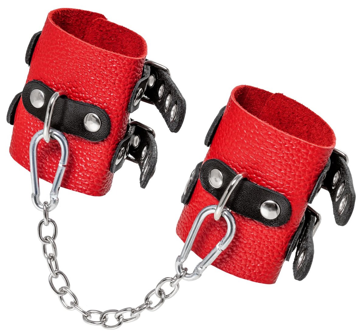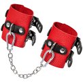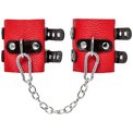 Не бойтесь своих желаний! Основатели бренда уверены: лучший способ избавиться от искушения - поддаться ему! Мягкие, красные, кожаные наручники с двумя чёрными, жёсткими ремнями могут стать стильным аксессуаром, а могут послужить вашим целям по своему прямому назначению. Частичное обездвиживание и невозможность двигать руками дают вам полную власть над партнером – взрослые игры для взрослых. Наличие двух колец и карабинов, соединенных между собой металлической цепочкой, позволяет использовать изделие как раздельно – аксессуар-манжеты, так и как наручники для фиксации. К широким металлическим кольцам также можно присоединить и другие аксессуары при помощи карабинов. Благодаря универсальному размеру наручники могут использоваться и мужчинами, и женщинами. Длина манжет - 18 см, ширина - 7 см.