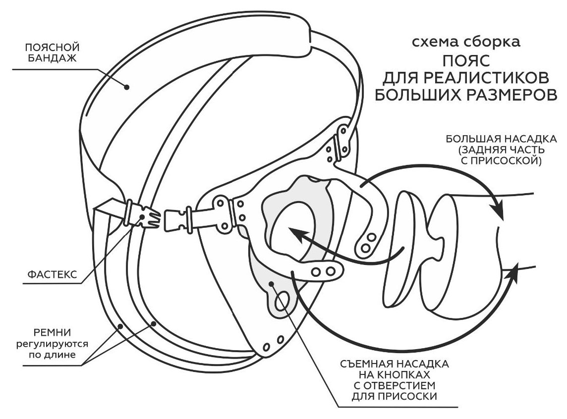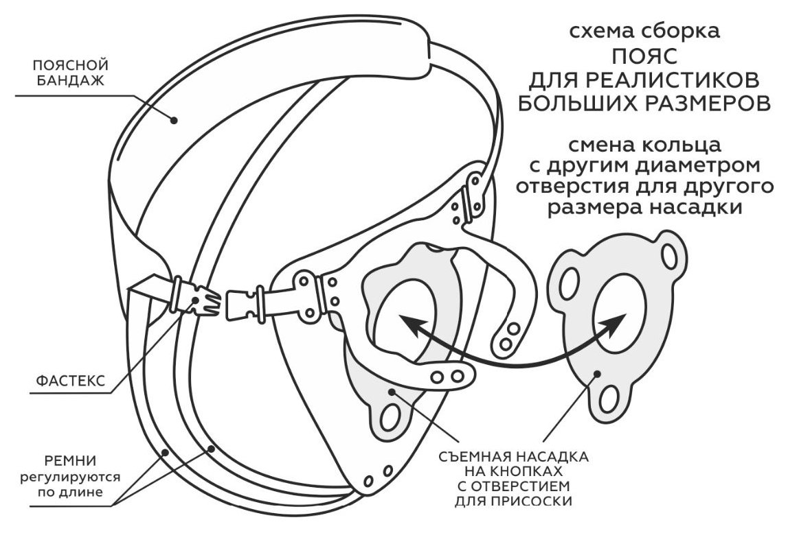 Пояс способен выдержать самый «солидный» размер насадки. Для этого проденьте насадку с присоской в отверстие. Присоска, соприкасаясь с телом, способна амортизировать нагрузки и даже присасываться к телу, дополнительно фиксируя изделие. В зависимости от размера снимите или оставьте съемное кольцо. И отрегулируйте «хомутик» с помощью кнопок для изменения диаметра по насадке-реалистику. Такой пояс можно использовать в очень широком диапазоне размеров.