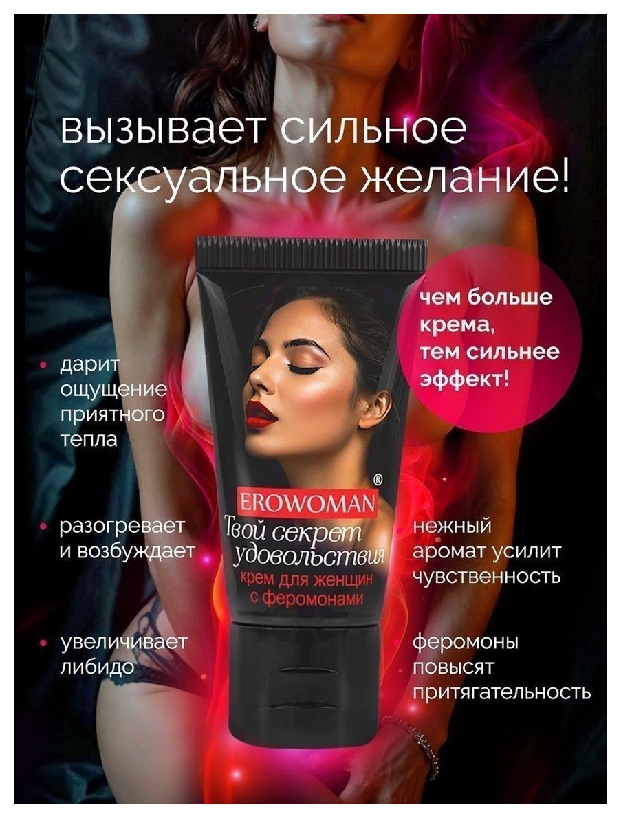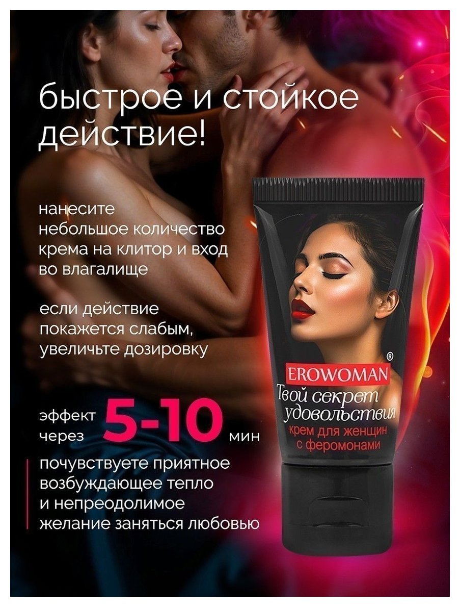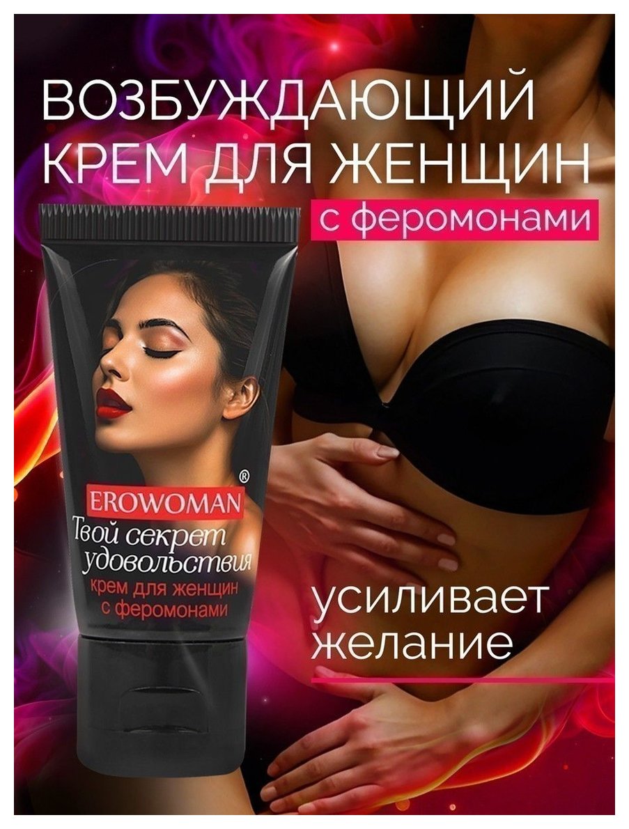 Возбуждающий крем для женщин EroWoman с феромонами - женский секрет удовольствия! Приятно разогревает и усиливает желание заняться любовью. Тонизирует и раскрепощает, увлажняет кожу интимных зон. Нежный аромат крема в сочетании с феромонами усиливает чувственность, повышает природную привлекательность и сексуальность. Крем можно использовать совместно с презервативами и секс-игрушками. Чем больше крема, тем сильнее эффект! Нанесите небольшое количество крема на клитор и/или вход во влагалище. Через 5-10 минут после нанесения крема вы почувствуете приятное возбуждающее тепло и непреодолимое желание заняться любовью. Можно приступать к половому акту. Если действие стимулятора покажется слабым, увеличьте дозировку.