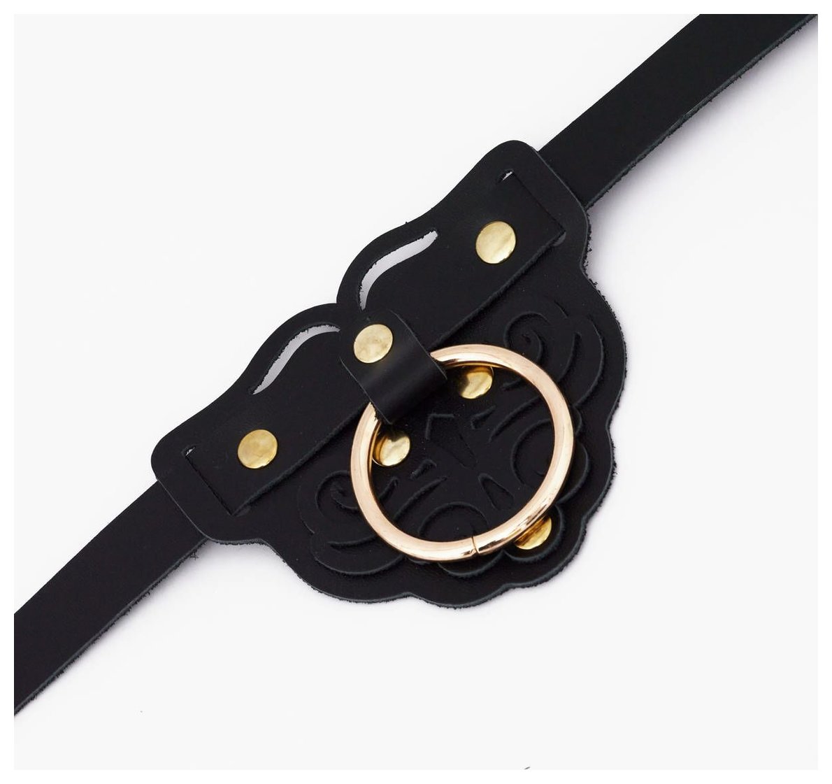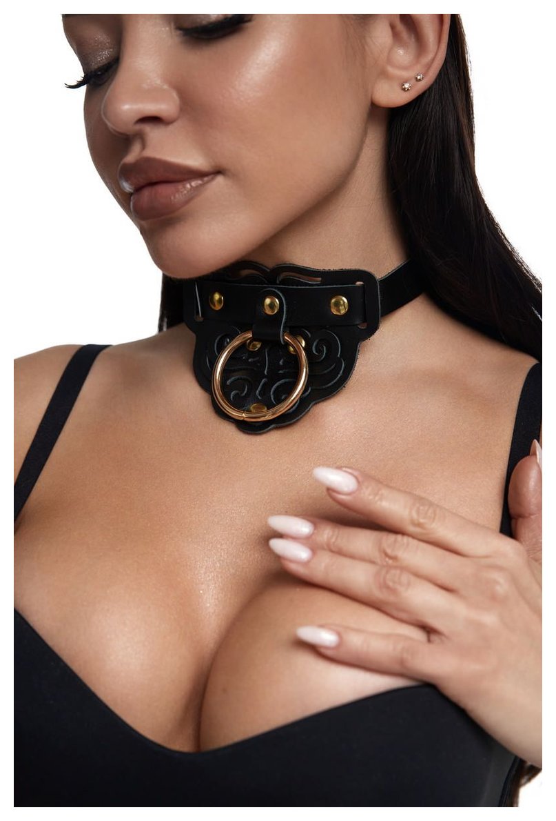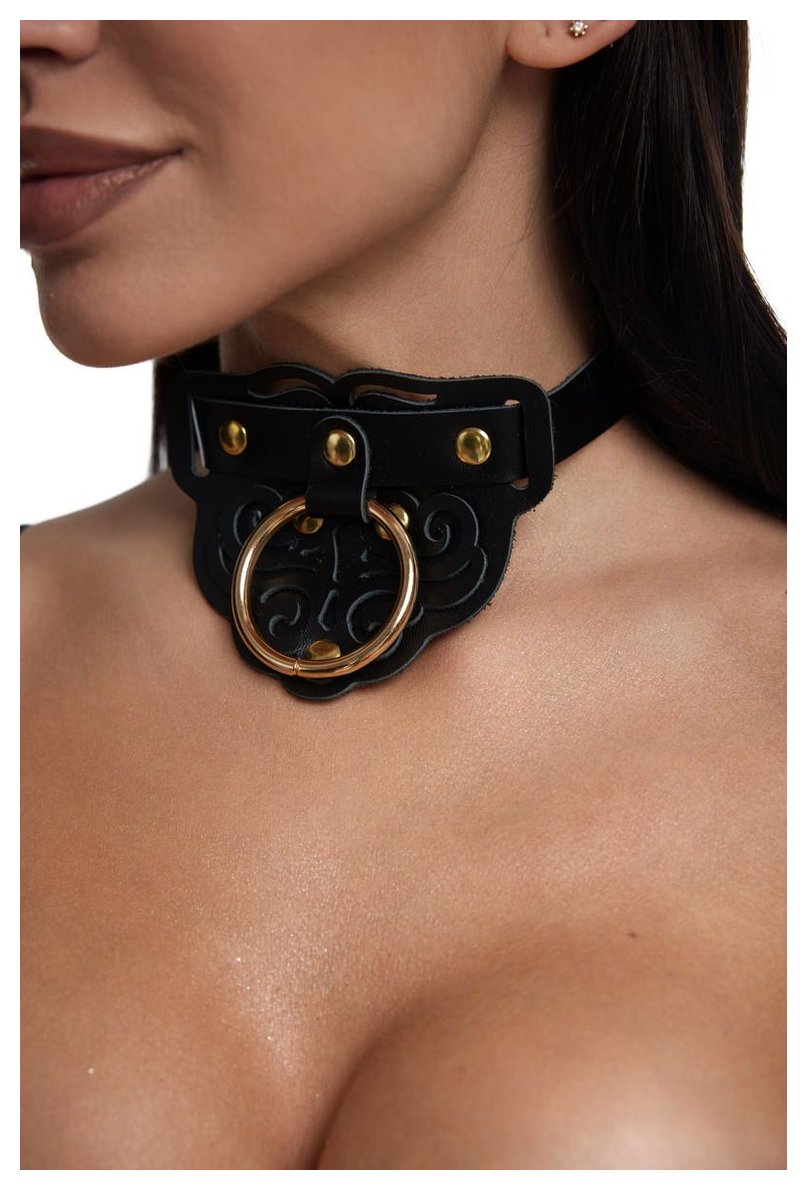 Представляем вам ошейник с уникальным дизайном , который станет вашим идеальным выбором для создания особой атмосферы. Этот ошейник — это гармоничное сочетание нежности, элегантности и функциональности, созданное для тех, кто ценит детали и безупречный стиль. Изделие выполнено из натуральной кожи треугольной формы с декоративными резными узорами , которые добавляют ему изысканности и индивидуальности. Основа состоит из двух частей: ремешка и узорной части, на которой расположено стальное кольцо с золотистым покрытием , подчеркивающее роскошь аксессуара. Резные элементы придают изделию нежность и элегантность, акцентируя внимание на красоте тела.
