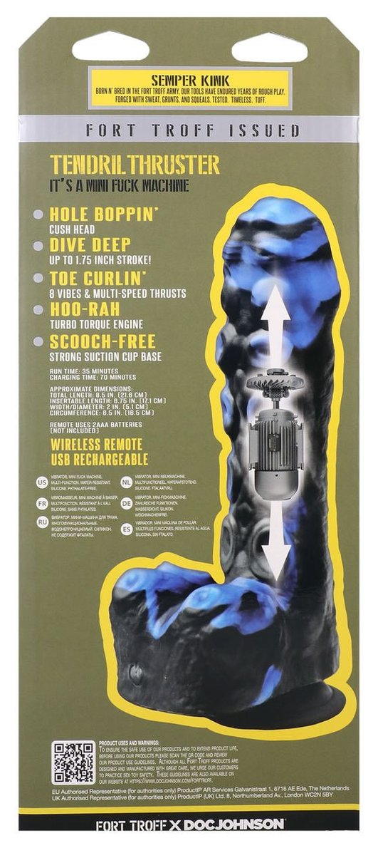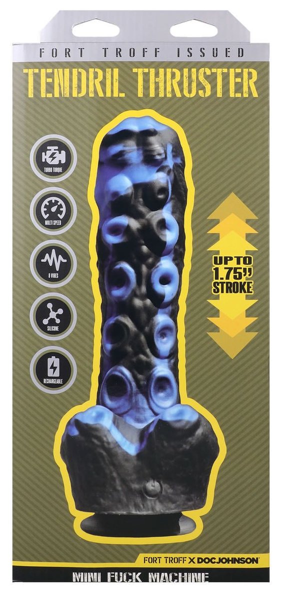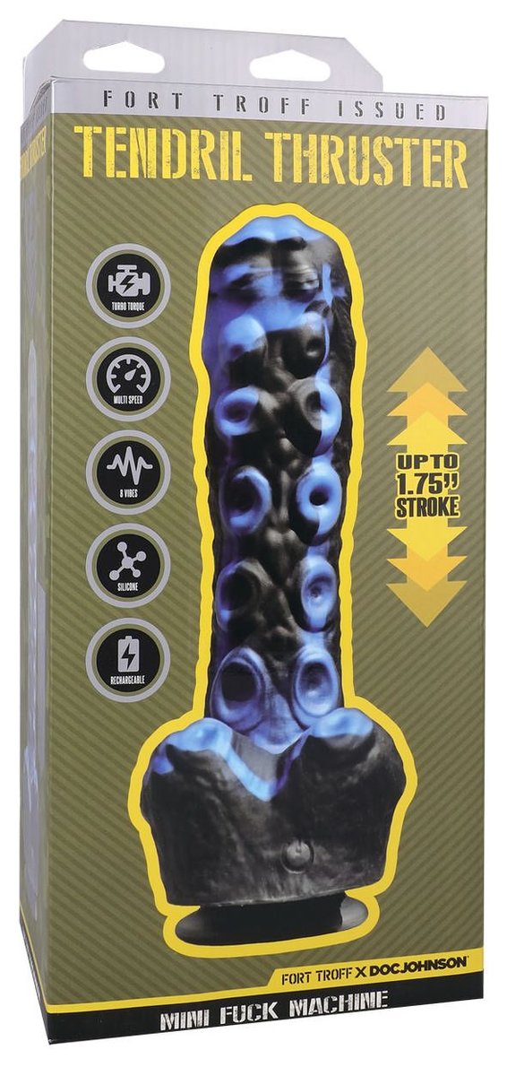 Fort Troff BLUE Tendril Thruster - компактная фак-машина с дистанционным управлением. ОСНОВНЫЕ ХАРАКТЕРИСТИКИ: ✔ Мощный мотор с ходом 4,5 см – почти как у больших фак-машин ✔ 8 виброрежимов 2 скорости толчков для разных сценариев игры ✔ Мягкая силиконовая головка с текстурой для дополнительной стимуляции ✔ Супер-присоска для надежной фиксации на любой поверхности ✔ Дистанционное управление (пульт в комплекте) кнопки на корпусе ✔ Автономная работа: до 35 минут после 1,5 часов зарядки Рабочая длина - 17,1 см.