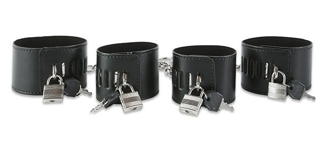 Эти две пары манжет помогут создать полноценный образ для Раба. Зафиксируйте своего партнера в удобном для вас положении – сегодня же он выполняет все прихоти своего Господина! Бондаж имеет вид четырех манжет, соединенных хромированными цепочками. Манжеты изготовлены из кожзаменителя и декорированы никелированными заклёпками и пластинами. Фиксаторы для рук и ног регулируются по размеру. Длина наручников - 25 см., ширина - 6 см. Длина наножников - 30 см., ширина - 6 см.