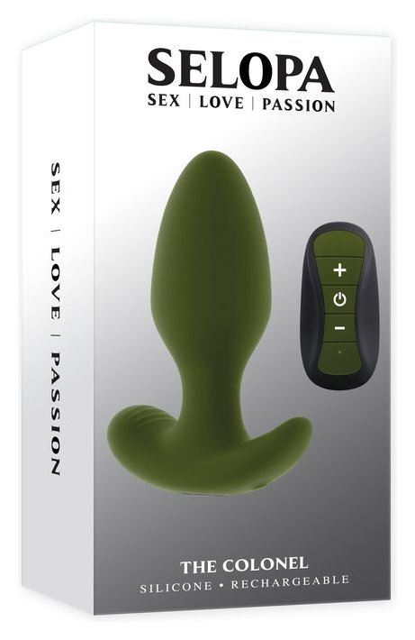 The Colonel — это массивная вибрирующая пробка с дружелюбной округлой формой и суженным круглым кончиком для плавного введения. Её мощный мотор управляется с помощью пульта дистанционного управления или кнопки на широком основании. Особенности: 3 скорости и 7 режимов вибрации: разнообразие настроек для индивидуального подбора интенсивности и ритма. Безопасные материалы: изготовлено из гипоаллергенного силикона и ABS пластика, свободного от фталатов и латекса. Удобная зарядка: встроенная USB-зарядка для быстрого и удобного восстановления энергии. Дальность пульта: до 9 метров. Водонепроницаемость: полностью водонепроницаемое устройство, идеально для использования в ванне или душе. Рабочая длина - 7,9 см.