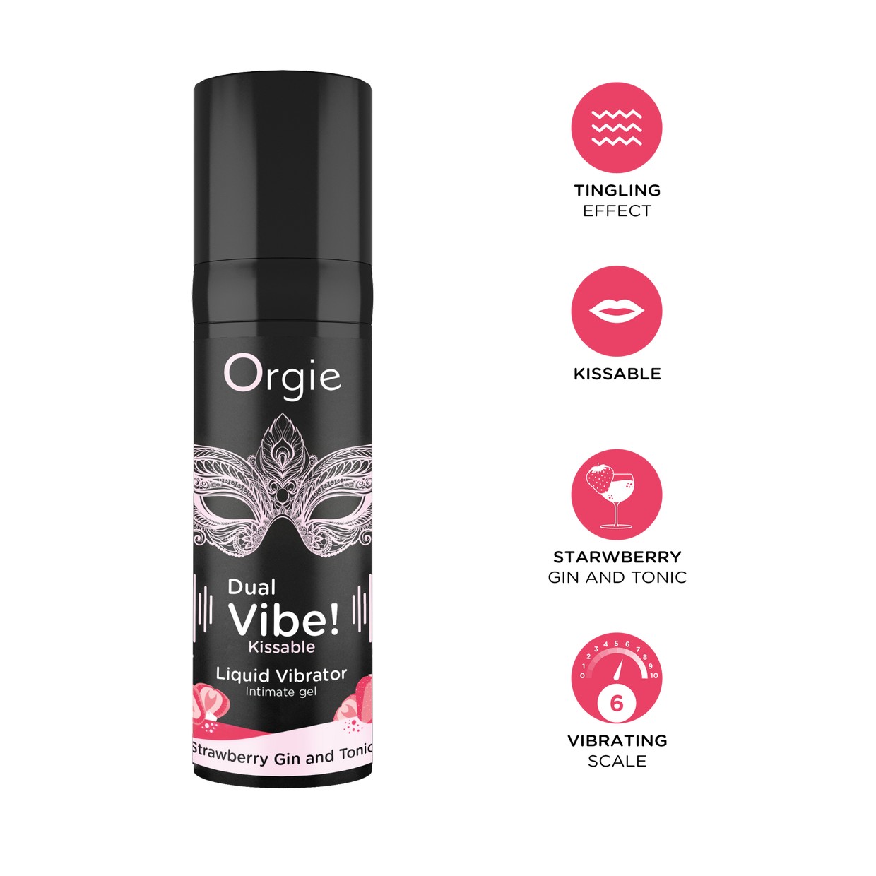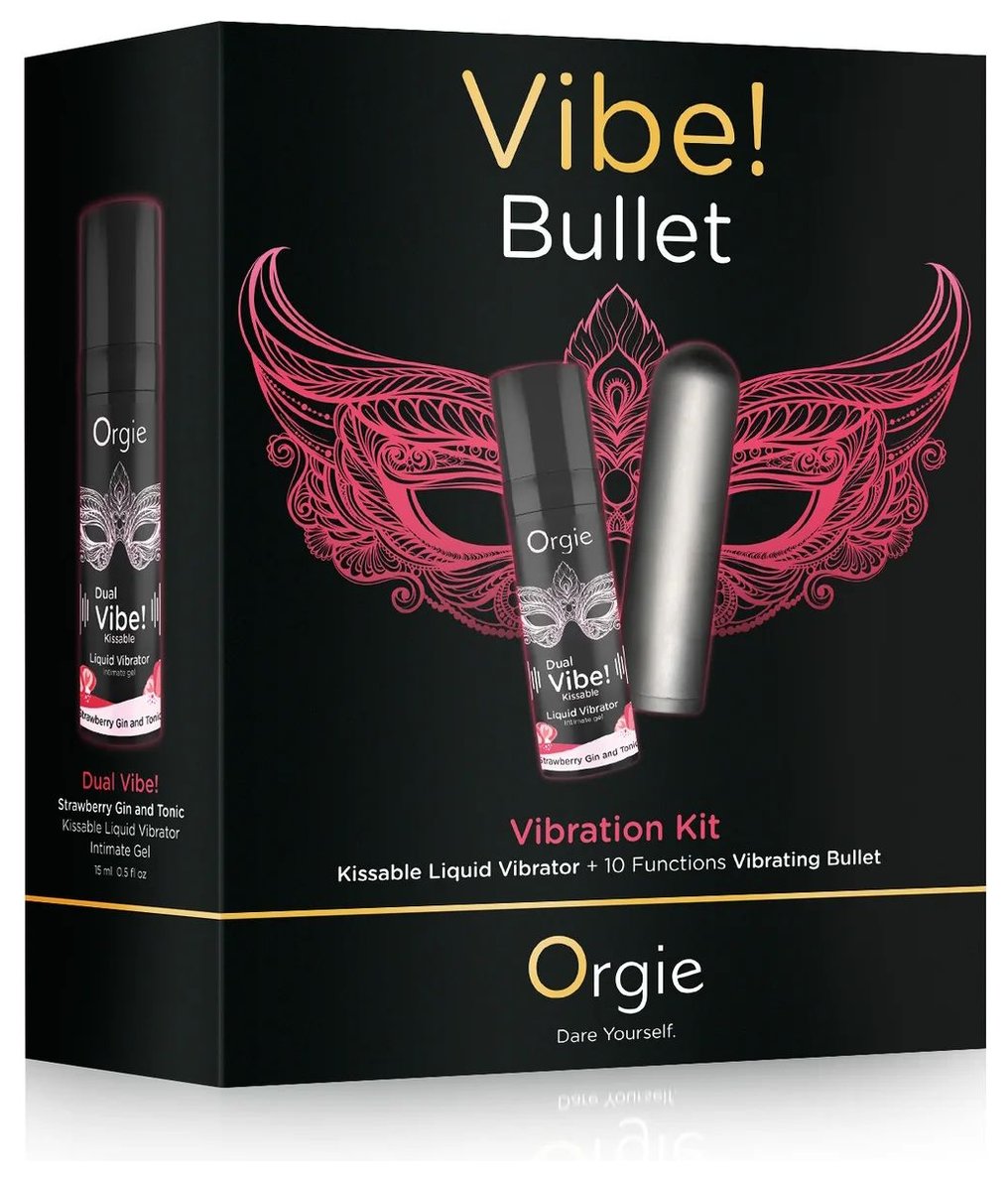Откройте новые грани удовольствия с Orgie Vibe! Bullet. В набор входит возбуждающий гель Dual Vibe! со вкусом клубничного джин-тоника и мощная вибропуля с 10 режимами вибрации. Компактный размер – максимальные ощущения. Dual Vibe! Kissable Liquid Vibrator Strawberry Gin And Tonic – гель с покалывающим эффектом и соблазнительным вкусом, усиливающий ощущения при оральных ласках. Вибропуля – 10 режимов вибрации от нежных до интенсивных, компактный дизайн и мощный мотор. Идеально подходит для пар и соло-использования. В комплекте: вибропуля с кабелем для зарядки, жидкий вибратор Dual Vibe! Kissable Liquid Vibrator (15 мл.).