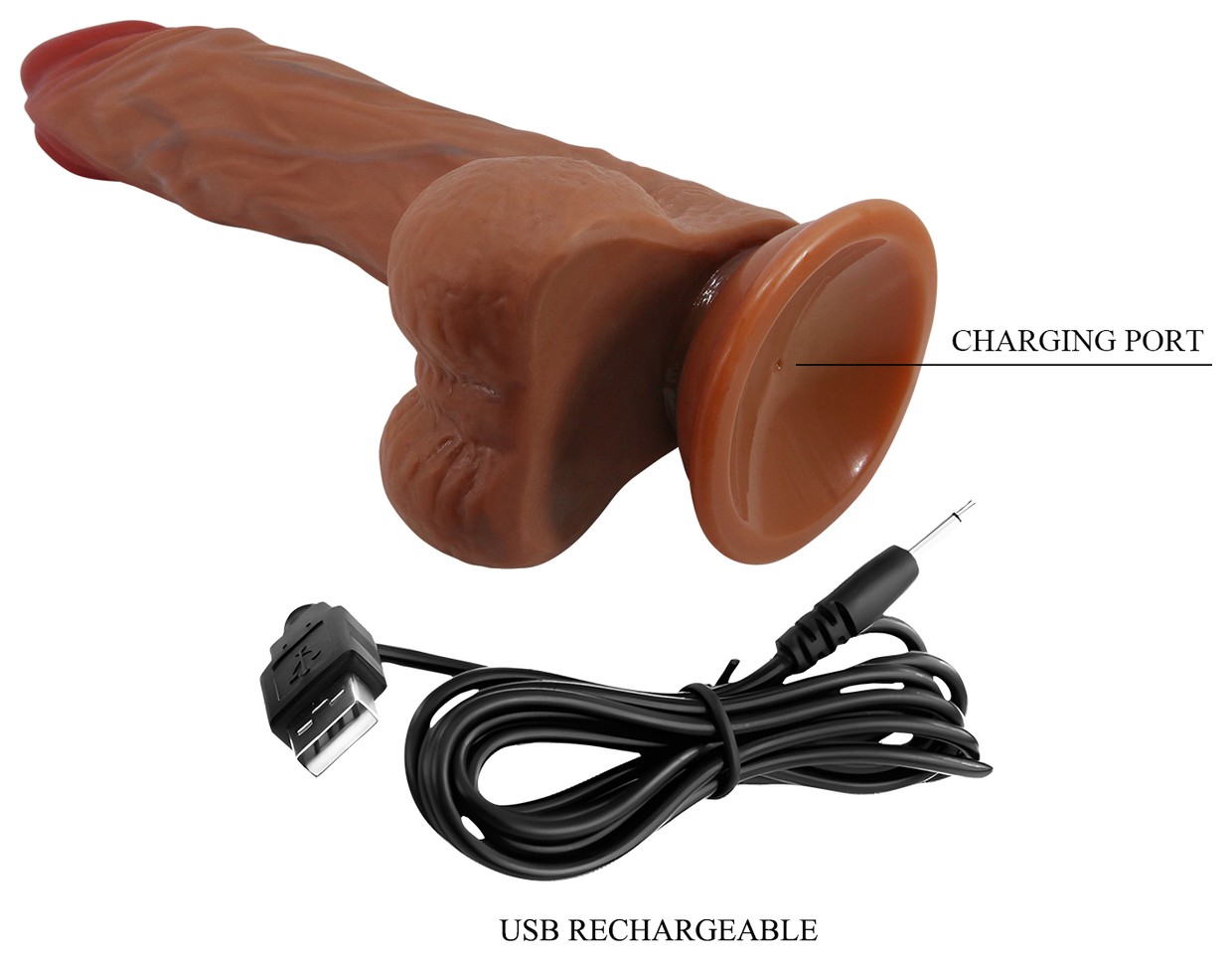 Реалистичный вибратор из TPR с 5 режимами вибрации, вращения и фрикции. Реалистичная текстура с головкой, венами и яичками для естественных ощущений. Присоска позволяет пользоваться игрушкой без рук. Заряжается через USB.