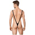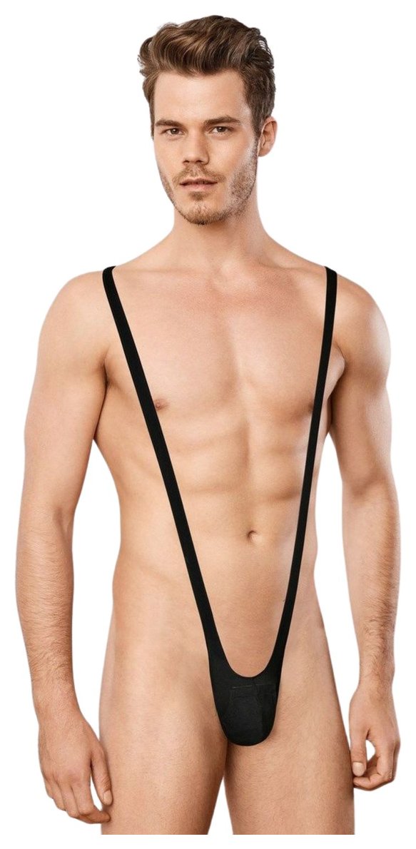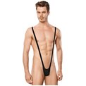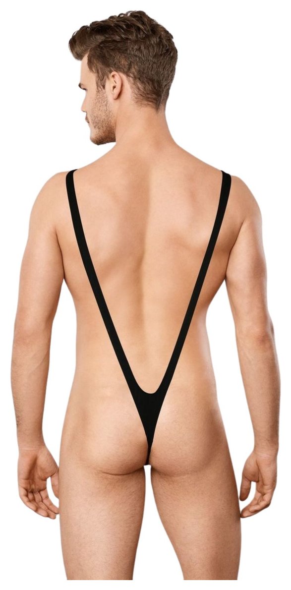 Очень откровенное мужское стринг-боди (стринги на лямках) из мягкого эластичного шелковистого материала. На передней части открывающийся клапан с застёжкой на двух кнопках.