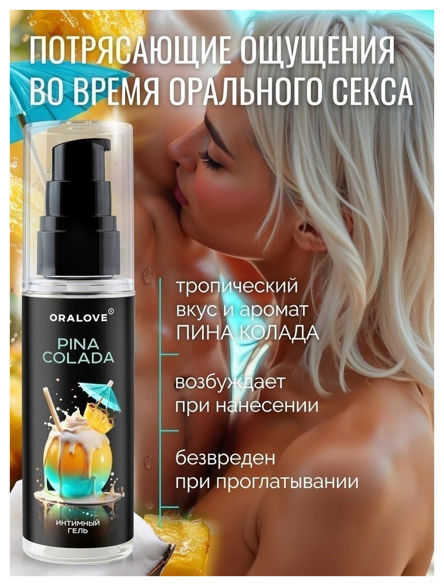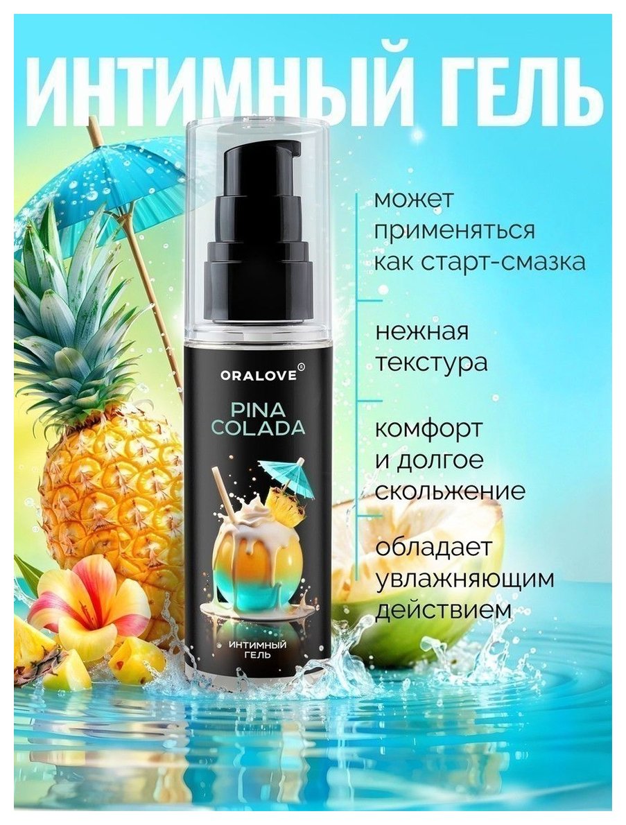 Гель на водной основе c тропическим вкусом и ароматом коктейля «Пина колада». Увлажняет и придаёт коже интимных зон приятный запах. Имеет нежную лёгкую текстуру. После нанесения не липнет. Легко смывается водой.