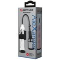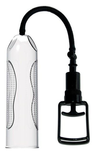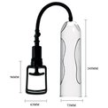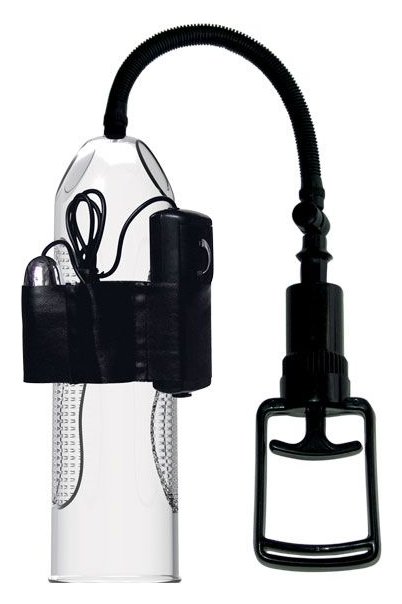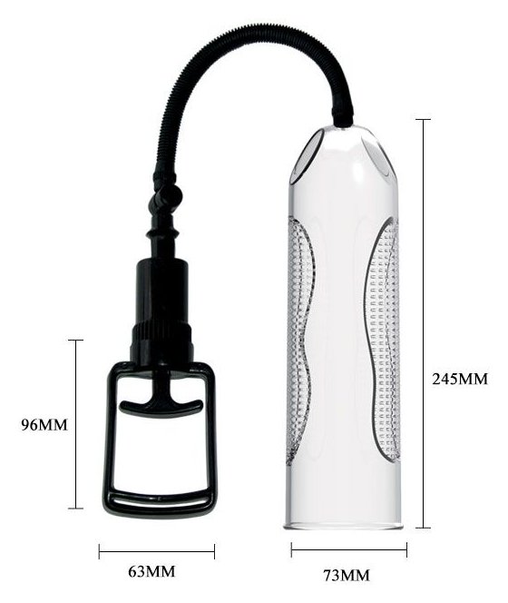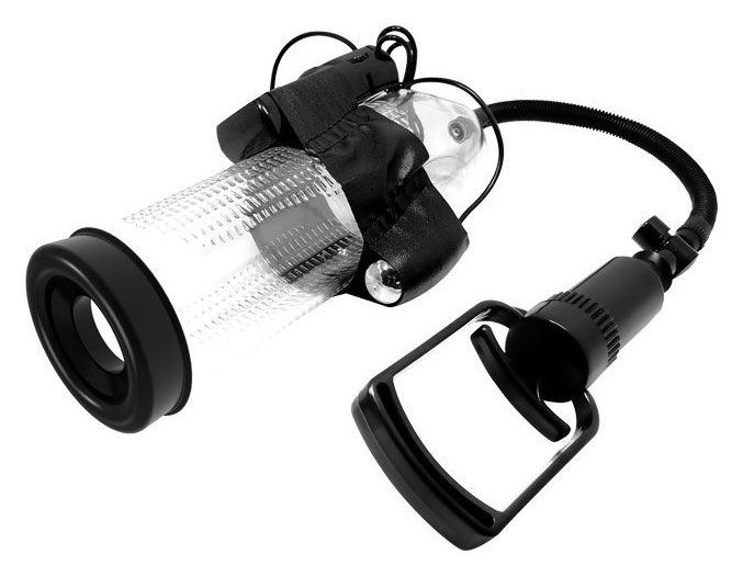 Вакуумная помпа с вибрацией, выполненная из прозрачного материала с уплотненной манжетой черного цвета, которая плотно обхватывает половой член, создавая полную герметичность. Воздух откачивается при помощи вакуумного шланга удобным механизмом откачки. Давление в колбе сбрасывается при помощи кнопки, расположенной на верхней части самой колбы. Механизм вибрации крепится к помпе с помощью эластичного материала с кармашком для виброяичка, которое управляется выносным пультом. Длина колбы - 24,5 см, диаметр - 7,3 см.