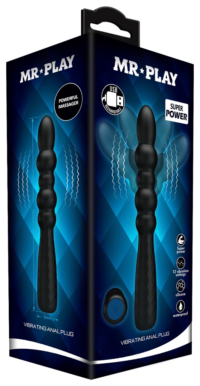 Черный гибкий анальный вибратор. Выполнен из силикона и имеет 12 режимов вибрации.
