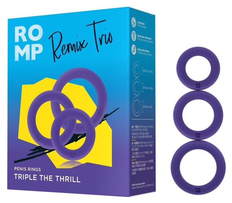 Romp Remix Trio предлагает на выбор три прочных, суперэластичных невибрирующих кольца для пениса, которые поддерживают стойкость и более сильную эрекцию. В набор входят 3 кольца с разным диаметром. Используйте их по-отдельности или все сразу, расположив на члене и мошонке, чтобы получать удовольствие как с партнером, так и в соло игре. Все предметы изготовлены из мягкого и безопасного для тела силикона, который отличается эластичностью и упругостью. Диаметр колец - 2, 2,5 и 2,9 см.