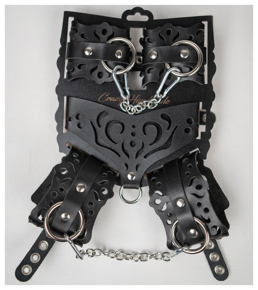 В набор входит ошейник, наручники и оковы. Доставляется в фирменной упаковке в виде брендированной деревянной подложки. Ошейник из натуральной кожи треугольной формы с декоративными резными узорами. На нижней части изделия расположено стальное хромированное кольцо. Наручники с авторским дизайном из натуральной кожи со стальным хромированным кольцом. Резные элементы придают атмосферу нежности, элегантности и подчеркивают красоту тела. Регулируются ремешком из натуральной кожи. В комплекте прочная соединительная цепочка с двумя карабинами. Оковы с авторским дизайном из натуральной кожи со стальным хромированным кольцом. Резные элементы придают атмосферу нежности, элегантности и подчеркивают красоту тела. Регулируются ремешком из натуральной кожи. В комплекте прочная соединительная цепочка с двумя карабинами. Длина ошейника - 44 см, ширина - 9 см, обхват - 32-41 см. Длина манжет наручников - 28 см, ширина - 7 см, обхват - 19-27 см. Длина манжет оков - 25,5 см, ширина - 7 см, обхват - 24-33 см.