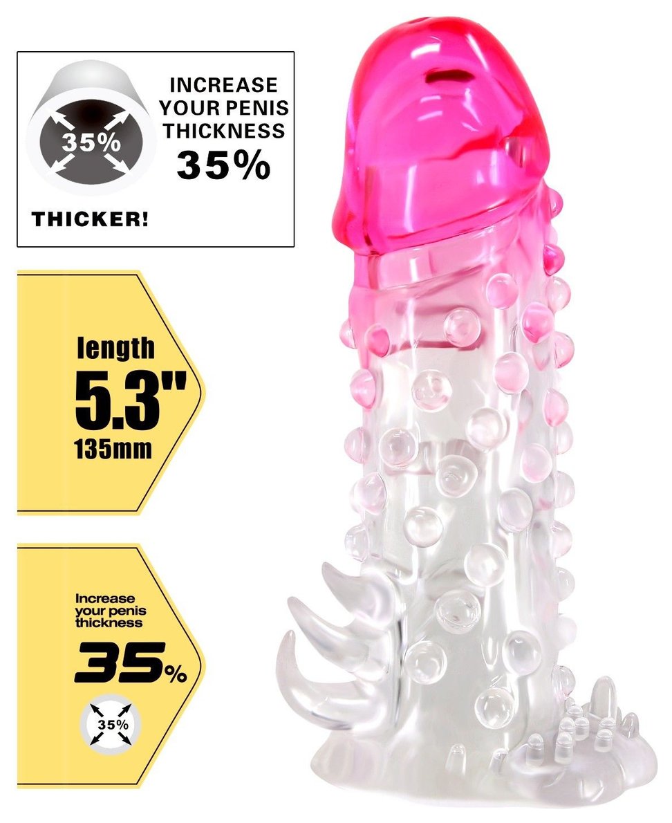 Оригинальная насадка на пенис для увеличения длины и толщины полового члена. Внесёт разнообразие в интимную жизнь и поможет мужчине почувствовать себя настоящим мачо. Хорошо очерченная мягкая головка, рельефная поверхность с разнообразными «шипиками» за счёт трения о стенки влагалища или ануса усилит возбуждение женщины и подарит ей незабываемый оргазм. Интимный аксессуар изготовлен из эластичного материала. Хорошо мнётся и тянется. Длина полости - 13 см, диаметр - 3 см.
