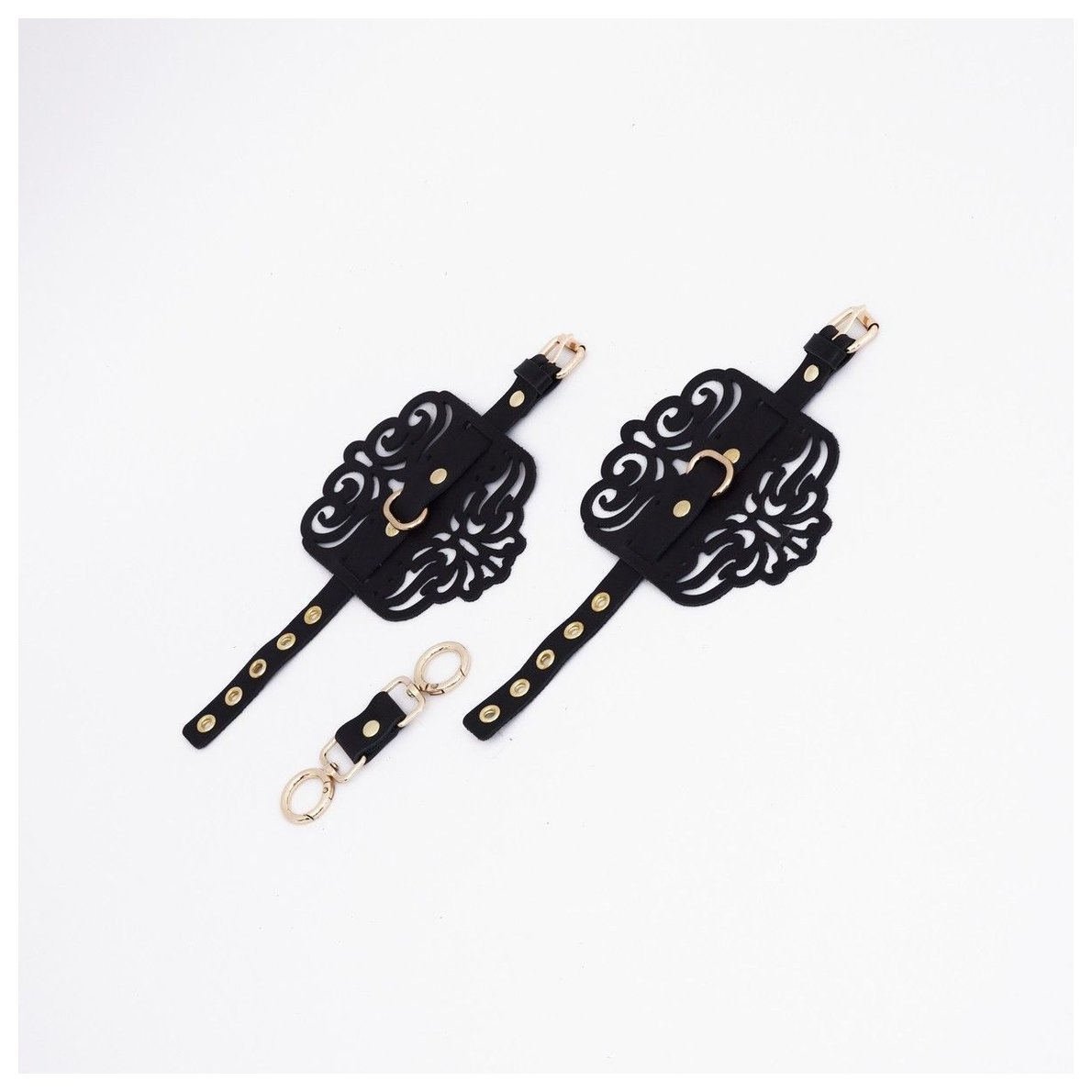 Наручники фигурные из натуральной кожи, украшенные узорами. Каждый элемент дизайна тщательно проработан, чтобы подчеркнуть красоту и элегантность изделия. Золотая фурнитура, сверкающая на фоне черной кожи, добавляет утонченности и изысканности. Полукольцо, расположенное посередине, предоставляет дополнительные возможности для фиксации рук с помощью соединительного элемента с двумя карабинами, который идет в комплекте. Доставляется в фирменной упаковке в виде брендированной деревянной подложки.