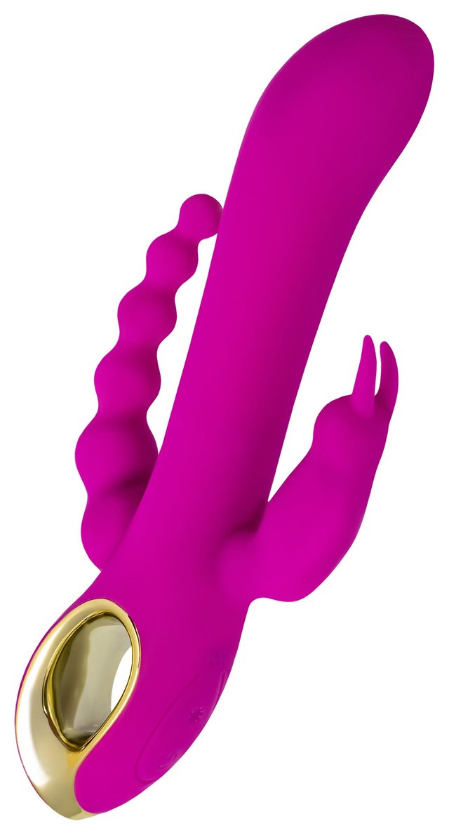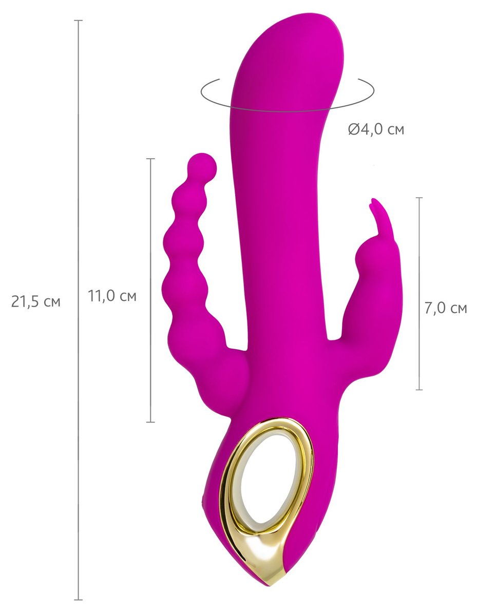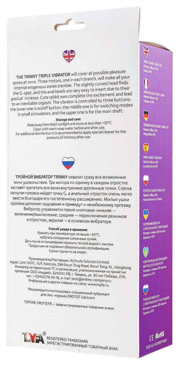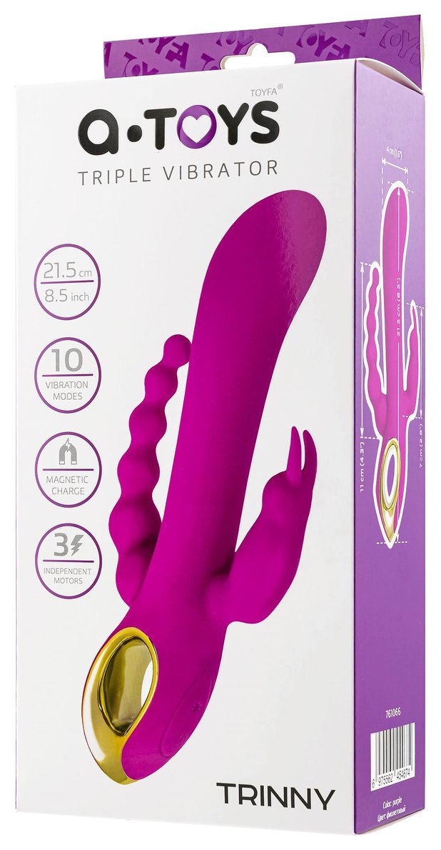 Тройной вибратор Trinny охватит сразу все возможные зоны удовольствия. Два мотора заставят трепетать все ваши внутренние эрогенные точки. Слегка загнутая головка найдет точку G, а анальный отросток очень легко ввести благодаря его постепенному расширению. Милые ушки кролика дополнят ощущения и приведут к неизбежному оргазму. Вибратор управляется тремя кнопками: нижняя - включение/выключение, средняя - переключение режимов в отростках, верхняя - в основном вибраторе. Рабочая длина - 13 см. Длина анального отростка - 11 см.