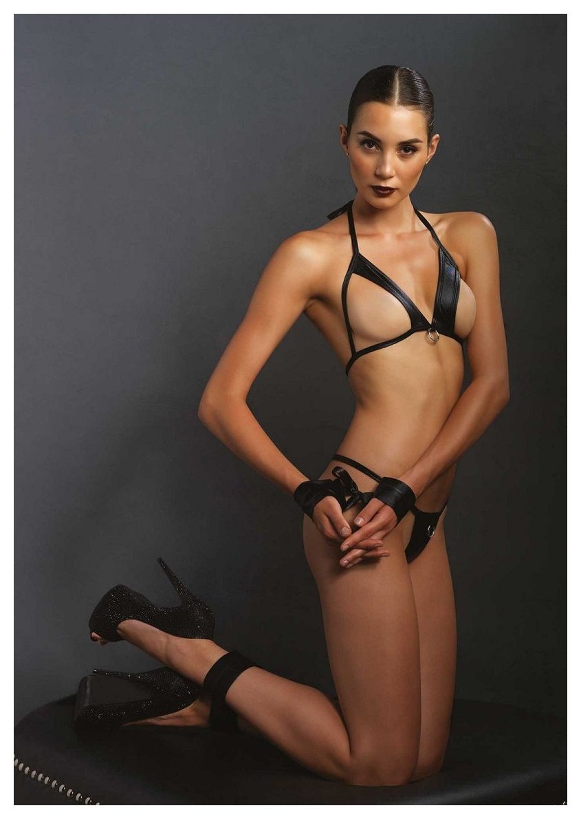 Провокационный комплект из ткани с эффектом мокрой кожи. В наборе: бондажные ленты для запястий и лодыжек, трусики-стринги, декорированные металлическим кольцом, и бюстгальтер из тонких полос ткани, обрамляющий грудь, но оставляющий ее полностью открытой. В комплекте: лиф, трусики-стринги, ленты для рук и ног.