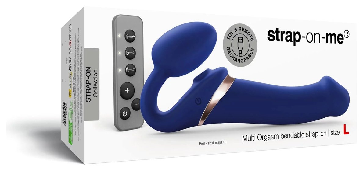 Синий безремневой страпон Multi Orgasm Bendable Strap-On size L с клиторальной стимуляцией