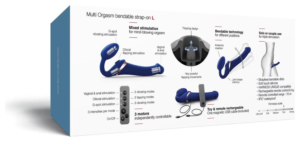 Strap-On-Me Multi Orgasm сочетает в себе элегантность и современность. Вибрирующий страпон оснащен 3 независимыми моторами, которыми можно управлять на расстоянии с помощью пульта дистанционного управления. Multi Orgasm изготовлен из силикона, без швов, с мягкой эластичной текстурой для комфортного проникновения. Водонепроницаемость IPX7. Точки стимуляции полностью оправдывают название страпона Multi Orgasm: 1. Мотор на самом конце стимулятора действует на простату в зависимости от вашей фантазии. 2. Мотор внутри втулки стимулирует активного партнера в точке G. 3. Третий мотор в зоне прилегающие ко входу во влагалище активного партнера дополнительно стимулирует вибрацией. Помимо трех моторчиков страпон оснащен дополнительным вакуумным стимулятором в области клитора. Страпон Multi Orgasm сочетающий в себе и вибрации и давление воздухом подарит по-настоящему яркие ощущения! Рабочая длина - 15,7 см, диаметр - 4,2 см. Диаметр вагинальной пробки - 3,9 см.