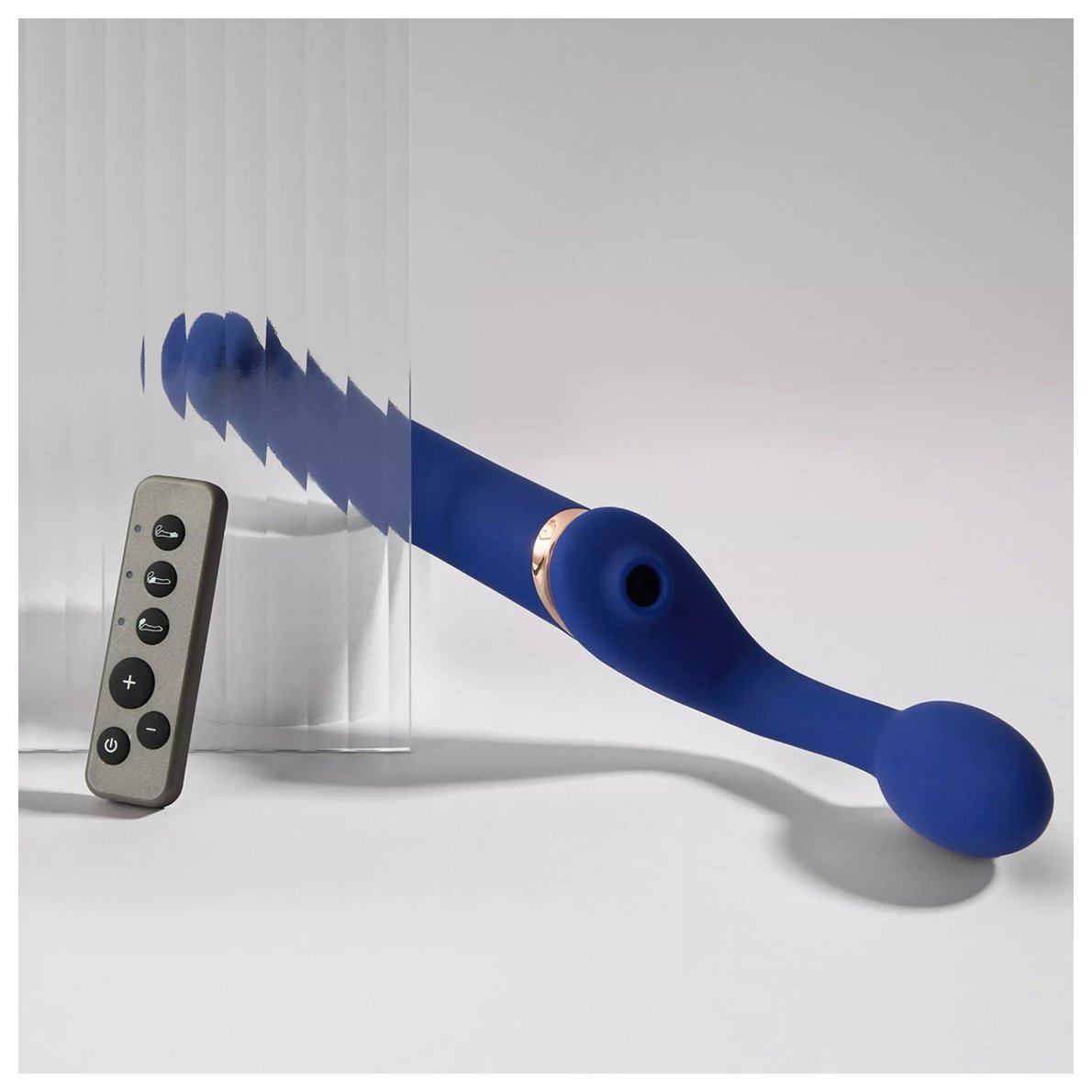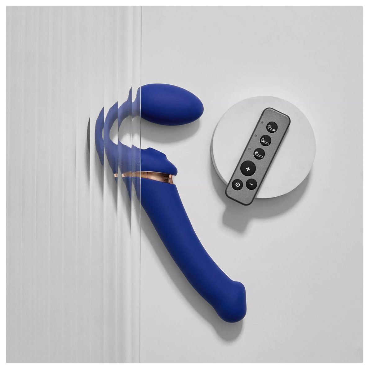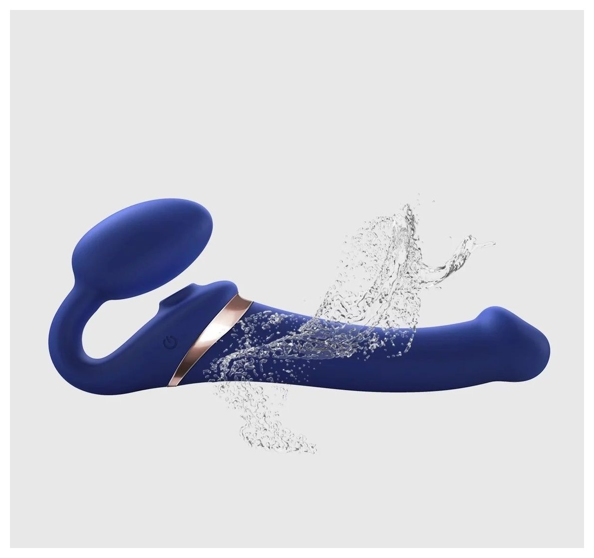 Синий безремневой страпон Multi Orgasm Bendable Strap-On size XL с клиторальной стимуляцией