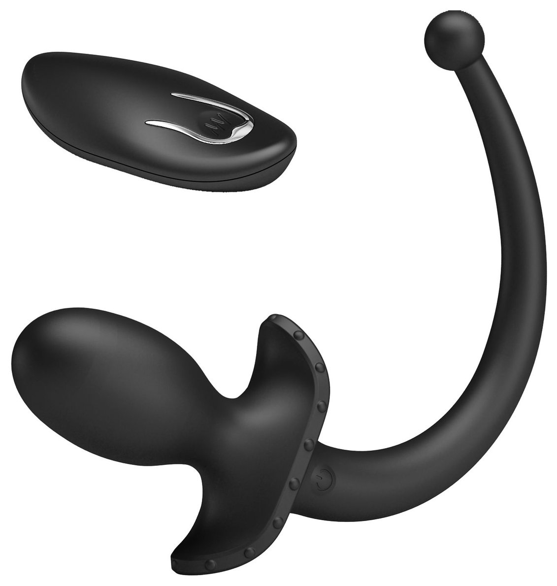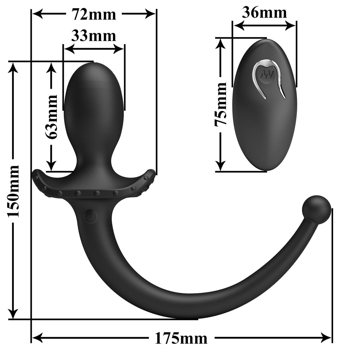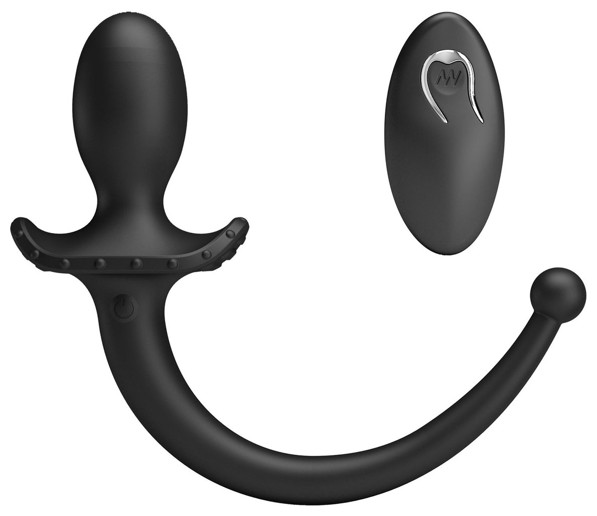 Черная анальная вибропробка с хвостом и пультом ДУ. Имеет 12 режимов вибрации и полностью водонепроницаемый корпус. Рабочая длина - 6,3 см.