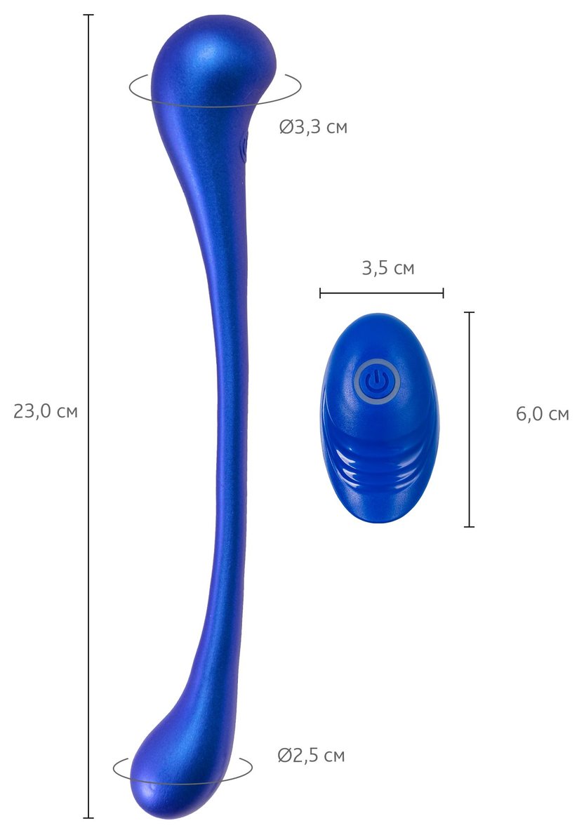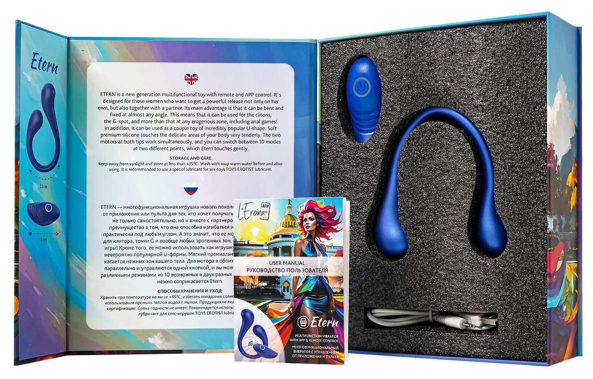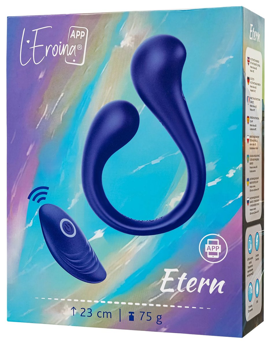 Etern — это многофункциональный вибратор нового поколения, созданный для девушек, которые хотят наслаждаться сами или вместе с партнером. Этот волшебный гаджет создан, чтобы дарить разрядку независимо от того, как ты его используешь. Его главный секрет? Etern изгибается и фиксируется практически под любым углом! Теперь ты можешь исследовать все свое тело: от клитора до точки G, от внешних эрогенных зон до анальных игр — этот вибратор способен на все. Но что действительно выделяет Inefy, так это его возможность быть универсальной игрушкой для пар. Благодаря популярной U-форме, его можно использовать вдвоем, открывая новые горизонты в отношениях. Мягкий, приятный на ощупь премиальный силикон нежно касается самых чувствительных участков твоего тела, обеспечивая комфорт и удовольствие. С двумя моторами на обоих концах, работающими параллельно, ты можешь насладиться одновременной стимуляцией в разных точках. Управляй этой маленькой магией одной кнопкой, выбирая из 10 разных режимов вибрации, которые делают каждый момент особенным. А возможность дистанционного управления с пульта или через приложение добавит интриги и остроты в ваши игры — ведь ты можешь доверить партнеру управление твоими ощущениями. Работа приложения осуществляется в тестовом режиме и может быть нестабильна. Etern водонепроницаем, так что он может сопровождать тебя и в ванной, и в душе, обеспечивая удовольствие в любой обстановке. А с его ярким синим металликом ты не только почувствуешь себя уверенно, но и будешь наслаждаться стильным аксессуаром в твоей коллекции игрушек. Etern станет твоим идеальным спутником для игр в одиночку или вместе с партнёром. Позволь ему делать твою жизнь насыщенной новыми, яркими и интригующими моментами, где бы ты ни находилась! Как управлять? На вибраторе: Удерживай кнопку 2 секунды, чтобы включить устройство. Переключайся между 10 режимами вибрации и наслаждайся новыми ощущениями. С пульта: Включи вибратор и управляй им, переключая режимы вперед-назад и ставя паузу в нужные моменты. Диаметр кончиков - 3,3 и 2,5 см.