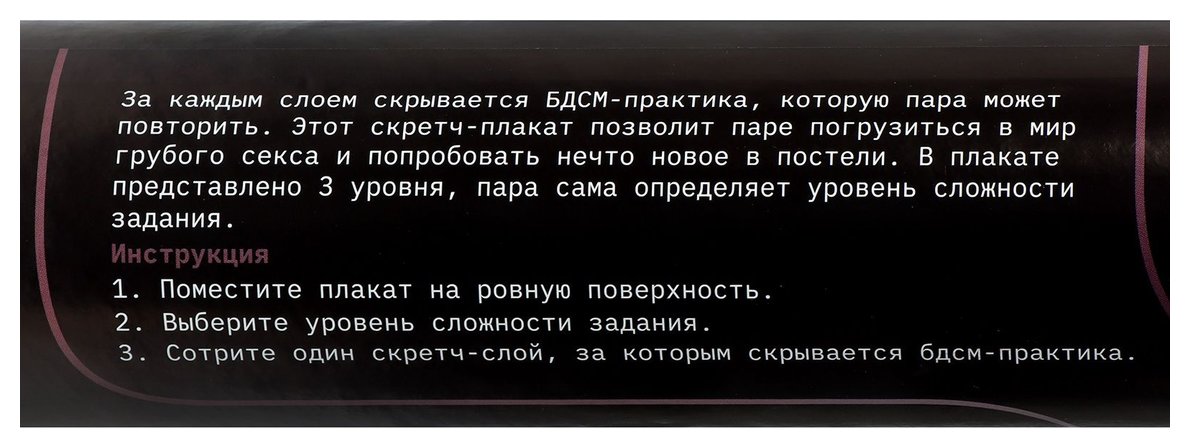 Плакат «BDSM» — это яркий и провокационный элемент для пар, желающих разнообразить свою интимную жизнь. Выполненный в формате A3 плакат предлагает уникальное сочетание искусства и игры, приглашая вас исследовать мир БДСМ и новые грани вашего взаимодействия. Он содержит множество идей и советов для безопасного и увлекательного погружения в мир ролевых игр, способствуя укреплению доверия и близости между партнерами. Позвольте своим сексуальным фантазиям стать реальностью с плакатом «BDSM»! В комплекте: плакат формата А3, тубус с инструкцией.