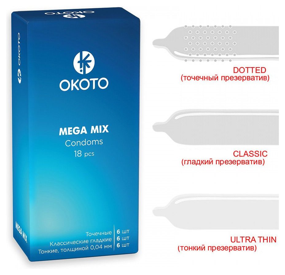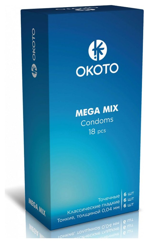 Презервативы OKOTO Mega Mix. В набор входит 6 презервативов классических гладких, 6 презервативов с точечной текстурой и 6 презервативов тонких. Номинальная ширина - 52 /-2 мм. Толщина стенки - 0,05 /-0,01 мм. - Регистрационное удостоверение РФ: ФСЗ 2012/11516 - Дата регистрации медицинского изделия: 03.02.2012 г. - Срок действия регистрационного удостоверения: бессрочно - Представитель изготовителя медицинского изделия: - - Номер модели: 204947