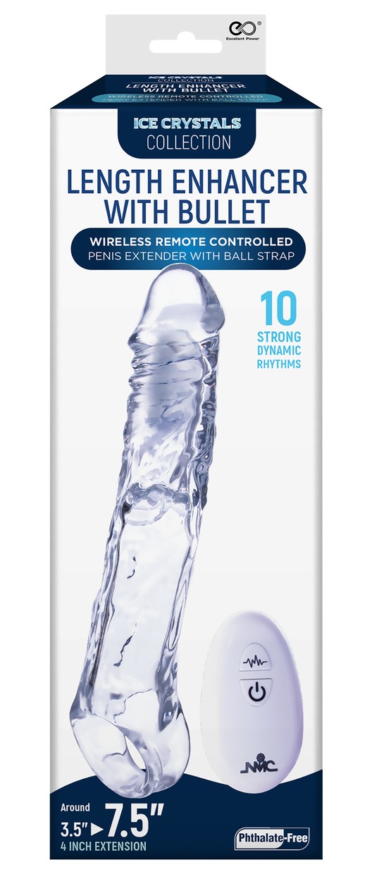 Прозрачная насадка-удлинитель Length Enhancer With Bullet с подхватом. Эластичная и приятная на ощупь. Перезаряжаемая вибропуля с пультом ДУ. Длина полости - 8,9 см.